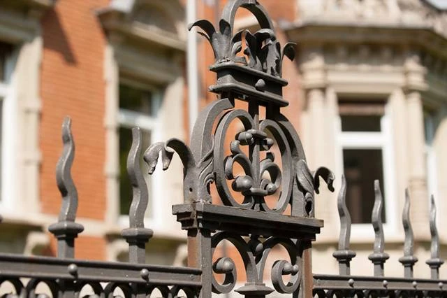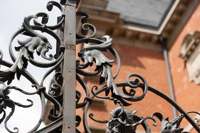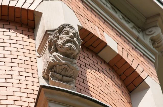 Das Gebäude weist die charakteristische Formensprache seiner Erbauungszeit auf. Das schiefergedeckte Gebäude hat eine rote Klinkerfassade, reich ornamentierte Natursteingesimste und -fenstergewände, Erker, Eckturm, schmiedeeiserne Gitter und Tore.