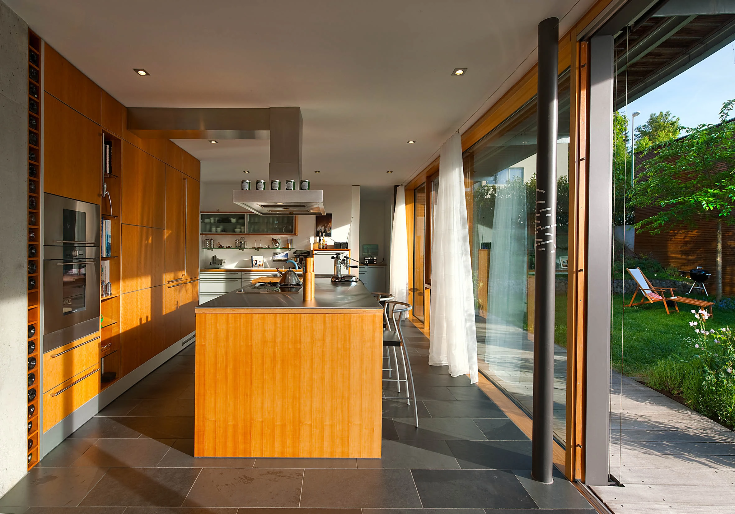 Der warme Kirschholzton von Möbeln und Parkett steht in Kontrast zu den Sichtbetonwänden und Schieferbelägen.