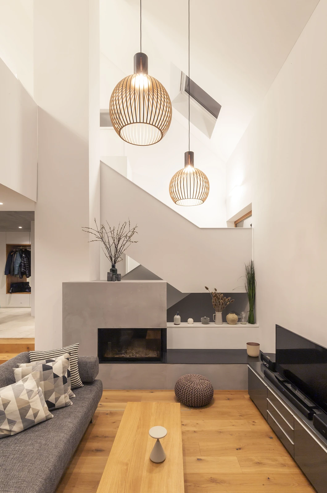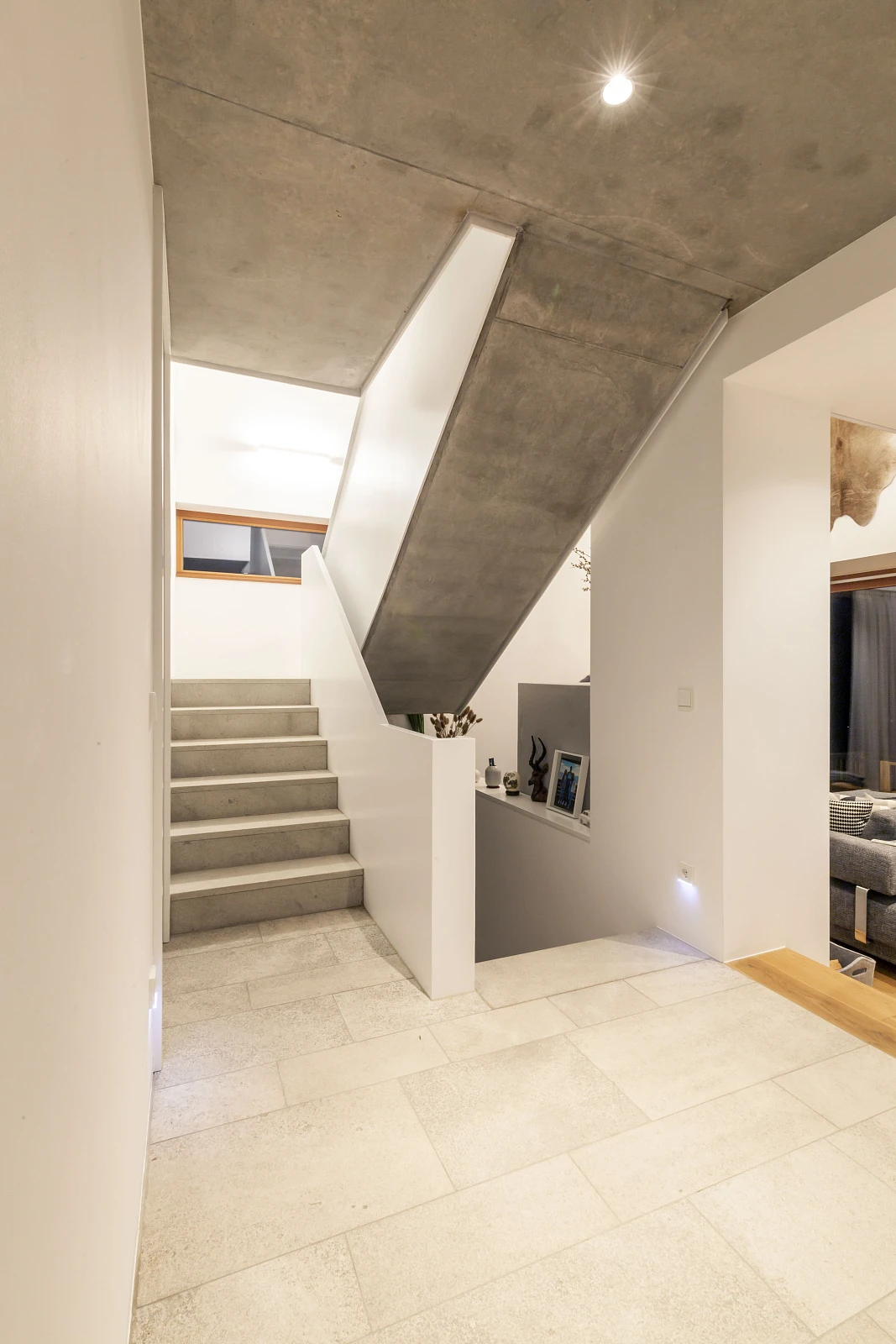 Der Entwurf des Wohnhauses ist durch eine klare Geometrie ohne Dachüberstand gekennzeichnet. Im Erdgeschoss wird neben dem Eingangsbereich der offene Wohn-, Ess- und Kochbereich für einen ebenerdigen Anschluss an das Gelände abgesenkt. Für eine luftige Atmosphäre sowie Blickbeziehungen sorgt der Luftraum über dem Wohnraum hin zur Galerie im Obergeschoss.