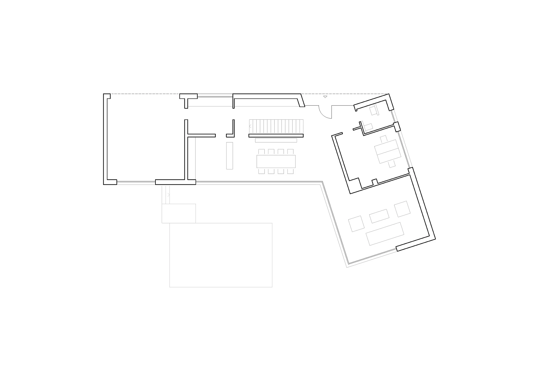 Das Wohnhaus ME ist ein zweigeschossiger, winkelförmiger Flachdachbau, der durch die in den Gebäudekubus integrierte Garage eine maximale Abschottung zur Straße ermöglicht. Der Gebäudewinkel folgt dem schrägen Grenzverlauf und gestattet eine weite Öffnung der Wohnebene zum geschütztem Innenbereich mit Terrasse, Pool und Garten. Diese leichte Drehung ist im Eingangsbereich ablesbar und wird durch den offenen Kamin am Drehpunkt akzentuiert.