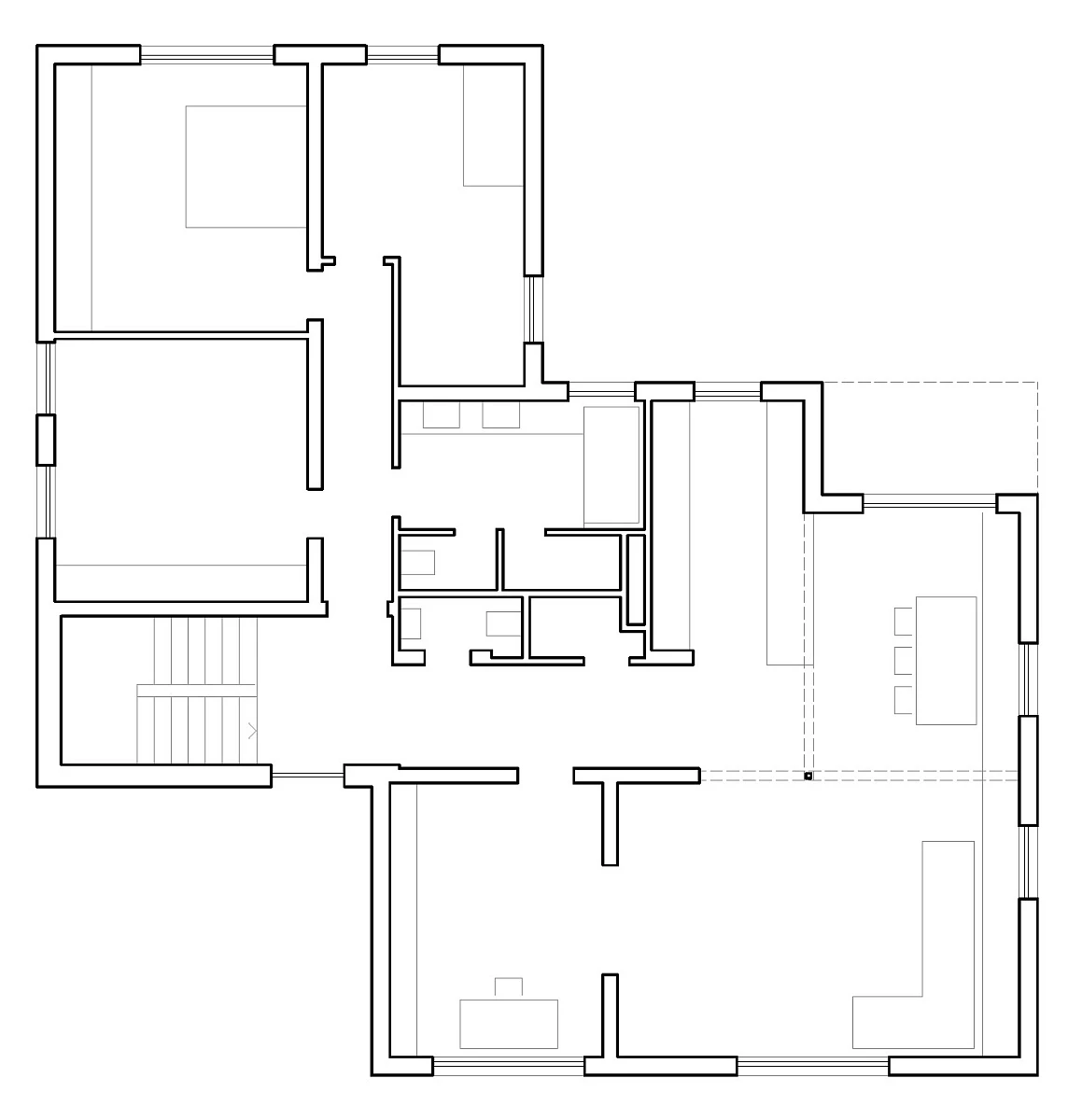 Im Inneren wurde der Grundriss grundlegend neu organisiert: Tragende und nicht tragende Wände wurden selektiv entfernt und neue Durchbrüche geschaffen. Ziel war eine offene Raumfolge mit großzügiger Eingangssituation sowie fließenden Übergängen zwischen Küche, Ess- und Wohnbereich.