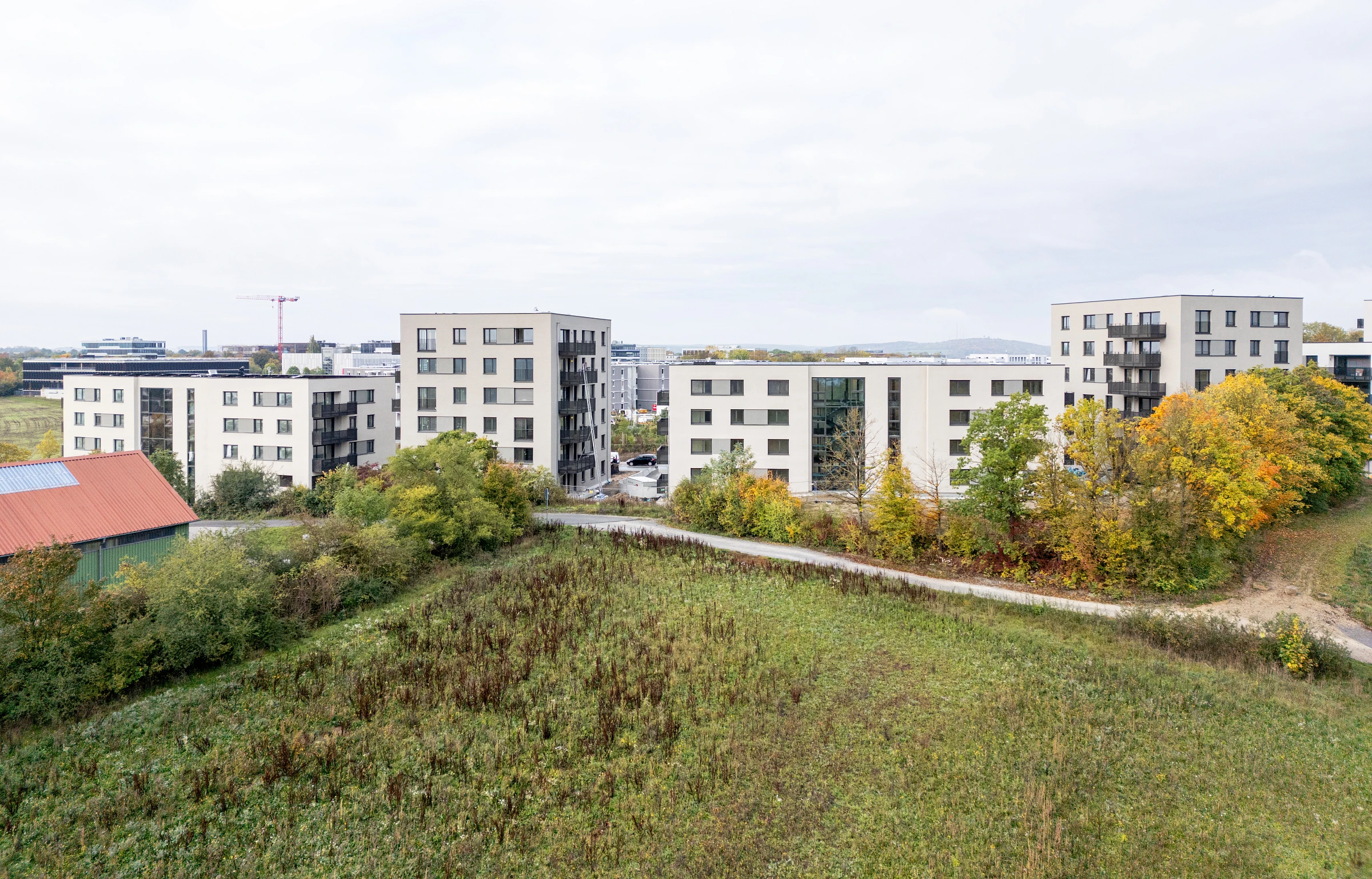 Das geplante Gebäudeensemble bildet den nordöstlichen Abschluss des neuen Stadtteils Hubland und schafft eine klare Raumkante zum Landschaftsraum. Die Anlage besteht aus acht Gebäuden, die dem gebogenen Straßenverlauf folgen. Ein 6-geschossiges Punkthaus mit 18 Wohnungen und ein 4-geschossiger Riegel mit 22 Wohnungen wechseln sich regelmäßig ab. Durch diesen Wechsel von Höhe und Abstand zur Straße entsteht eine gegliederte, aufgelockerte Struktur. Insgesamt umfasst die Wohnanlage 159 barrierefreie Wohnungen sowie einen Gemeinschaftsraum.