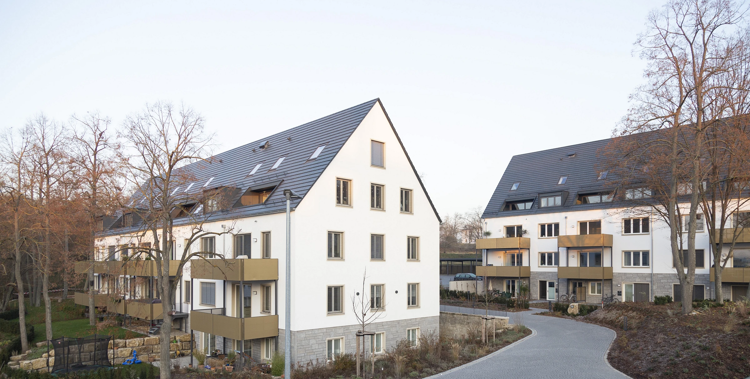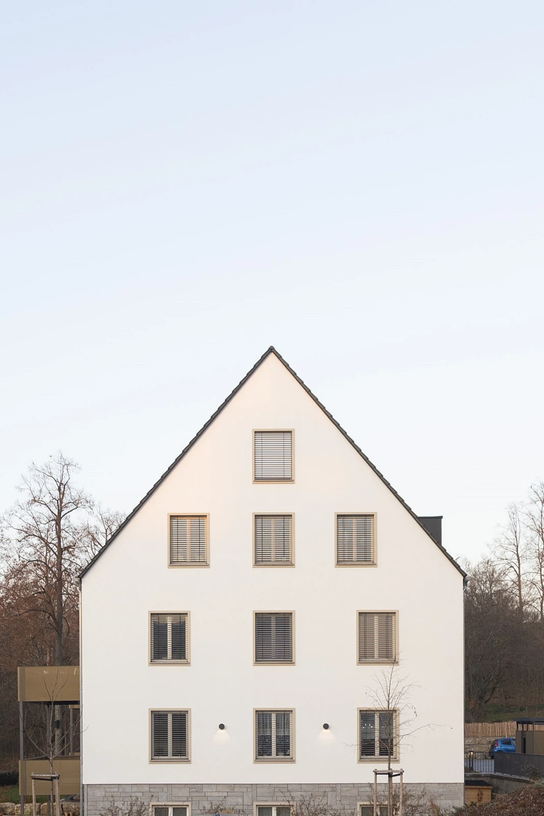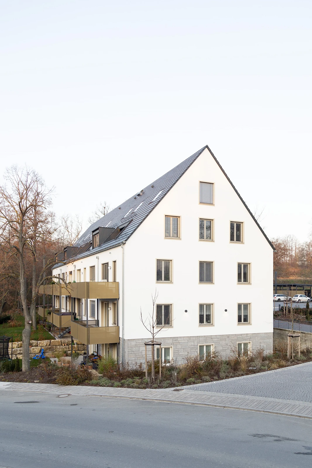 Das landschaftsprägende Grün, insbesondere der dichte Baumbestand, wurde nahezu vollständig bewahrt. Lediglich einige baumlose Flächen wurden in Parkplätze und Carports umgewandelt, die den Großteil der erforderlichen Stellplätze abdecken. Alle Oberflächen wurden erneuert, wobei die Materialwahl konsequent unter ökologischen und nachhaltigen Gesichtspunkten erfolgte. Ein zentrales Ziel war, den Primärenergieeinsatz der Gebäude möglichst gering zu halten.