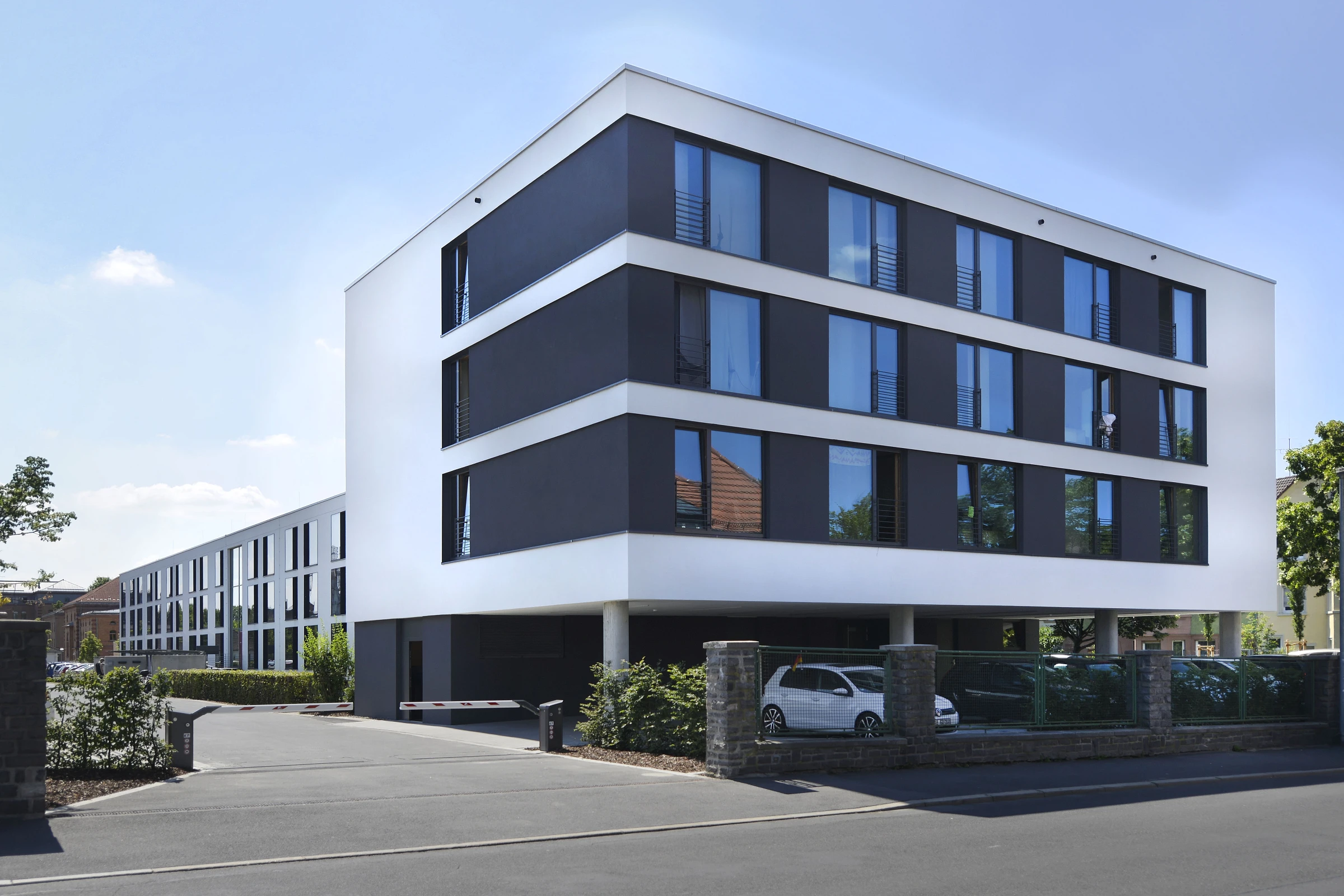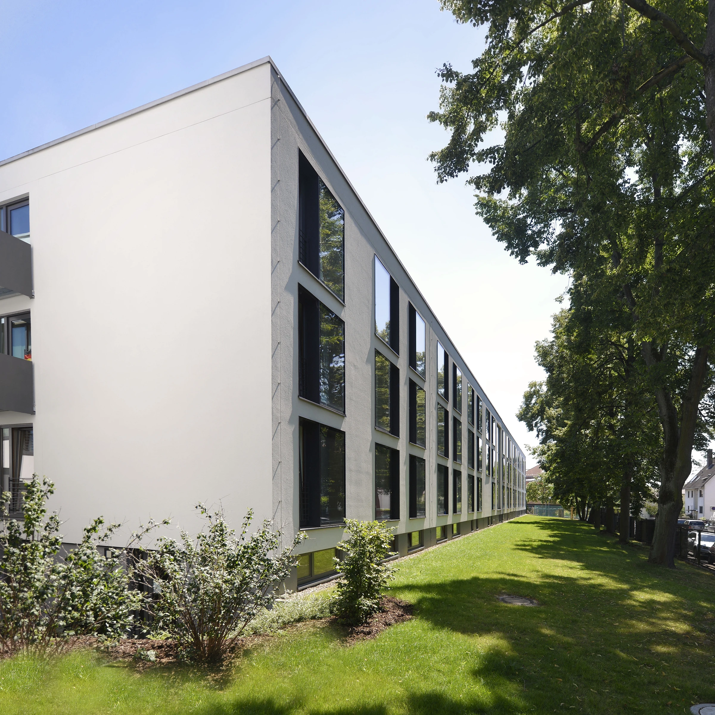 Nachdem die Umnutzung und Sanierung des ehemaligen Kasernengebäudes in ein Studierendenwohnheim aus Kostengründen nicht verwirklicht wurde, entstand an gleicher Stelle ein Neubau in drei Bauabschnitten. Das zweihüftig geplant, hell verputzte Wohnheim, welches sich in reduzierter Formensprache mit exakten Kanten präsentiert, wurde mit großzügigen, anthrazitfarbenen Fensterelementen für die Einzelapartments versehen.