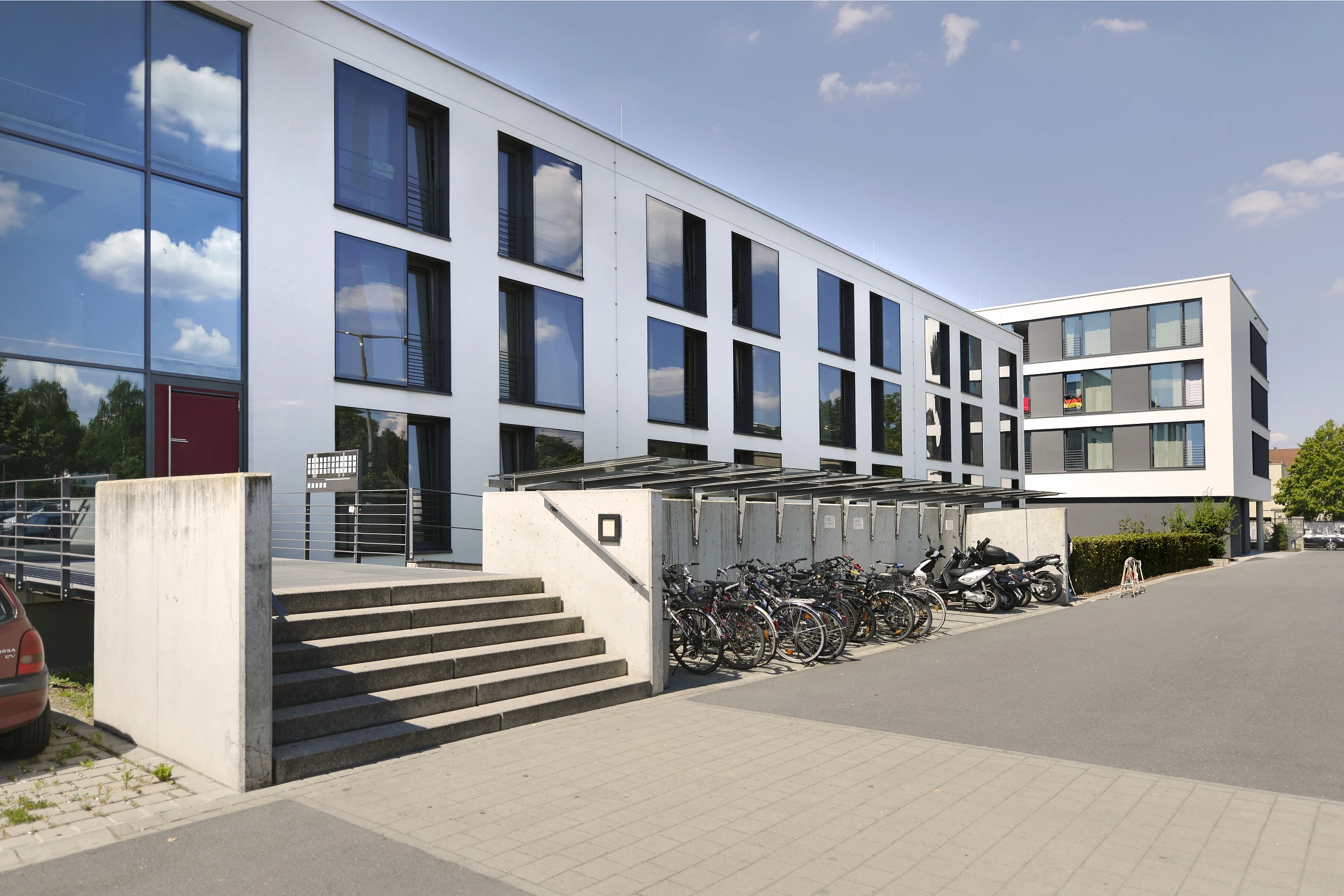 Im 1. Bauabschnitt entstanden 51 Einzel- und 2 barrierefreie Apartments mit Bad und Küchenzeile, im 2. Bauabschnitt 60 Einzelapartments. Sozial- und Nebenräume sind im UG angeordnet, welches an den Giebelseiten großzügig verglast