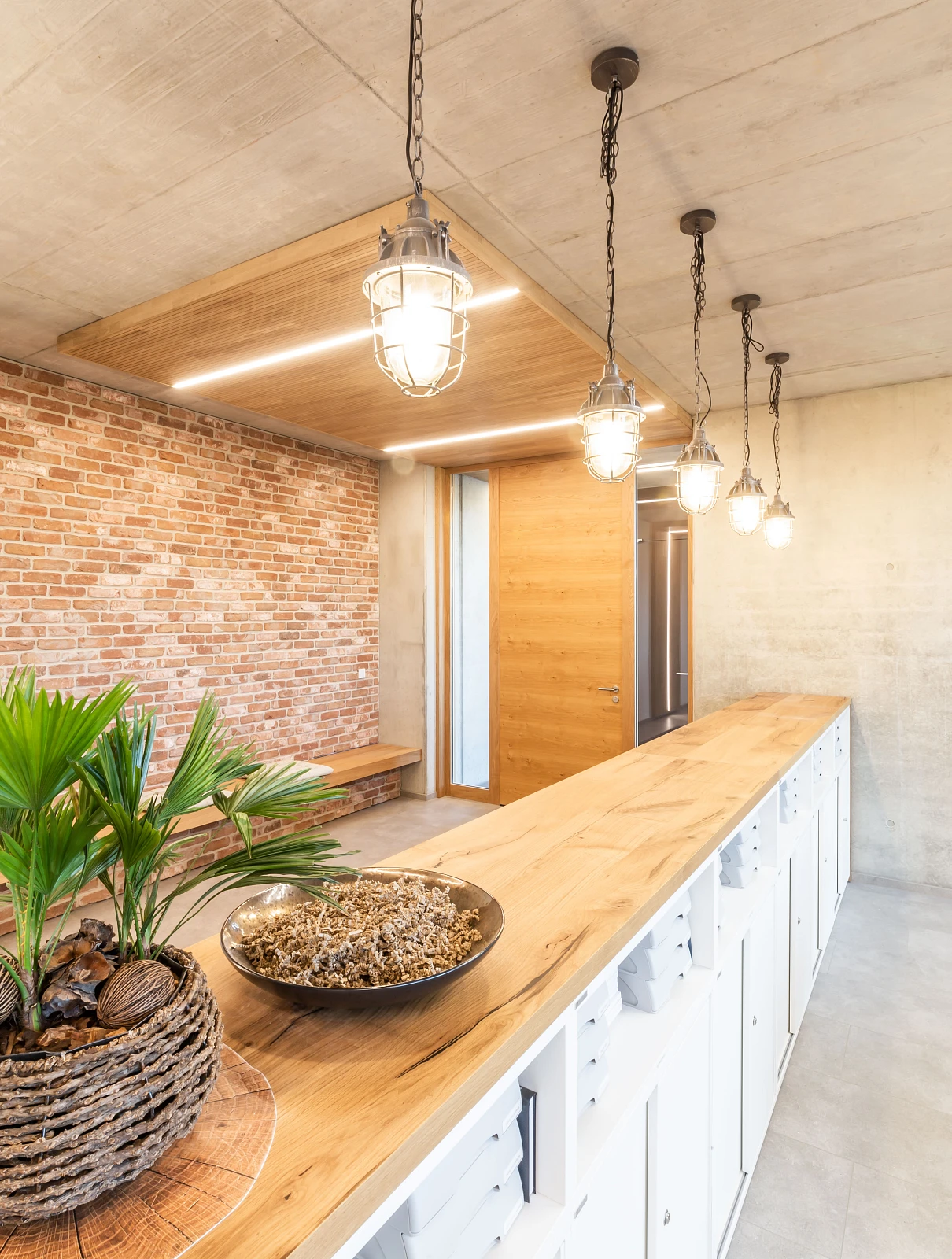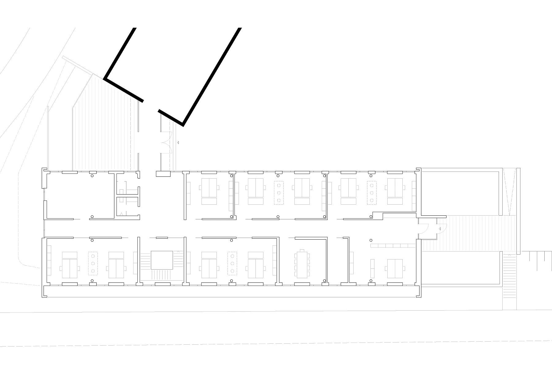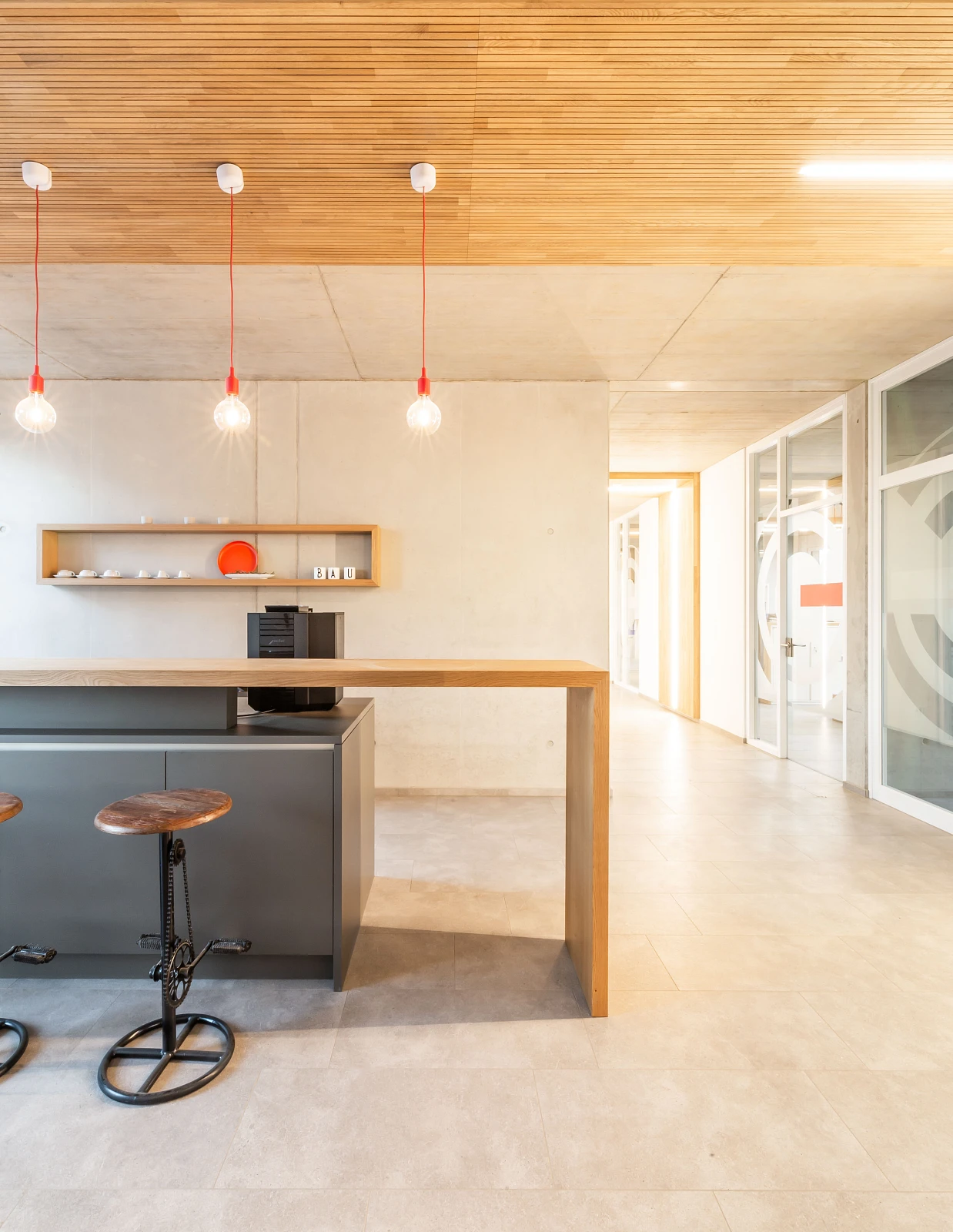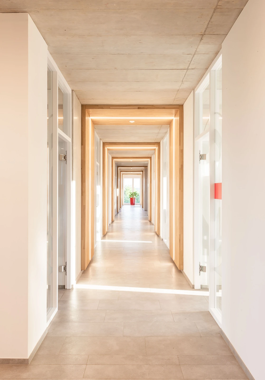 Das Verwaltungsgebäude bietet rund 50 Mitarbeiter*innen Platz. An einem Mittelflur werden großzügige Büroräume mit Ausblick ins Grüne angeordnet, kommunikative Aufenthaltsbereiche und Besprechungsräume weiten den Flur und schaffen Treffpunkte.