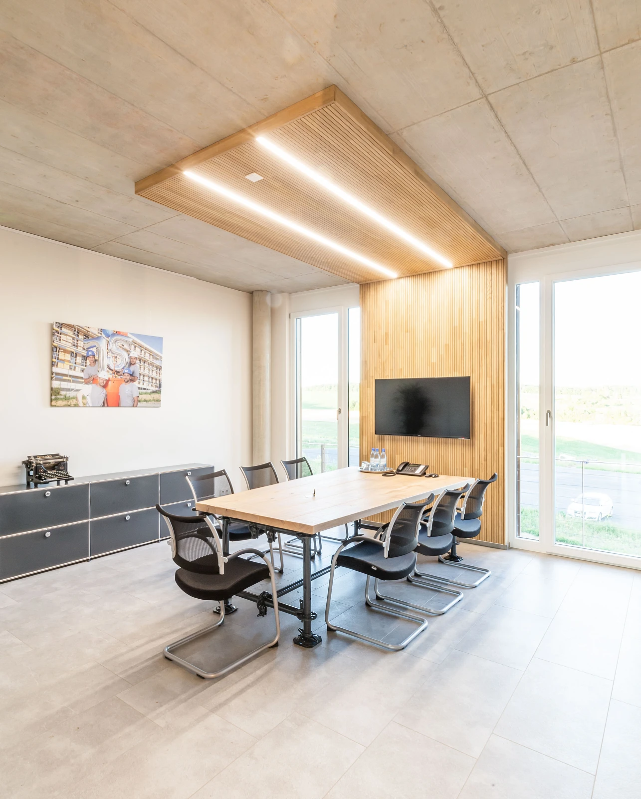 Verbindende Element zwischen Innen- und Außenraum ist die Materialwahl – kühler, glatter Sichtbeton und warmes Fichtenholz. Immer mit Blick in die grüne Landschaft.