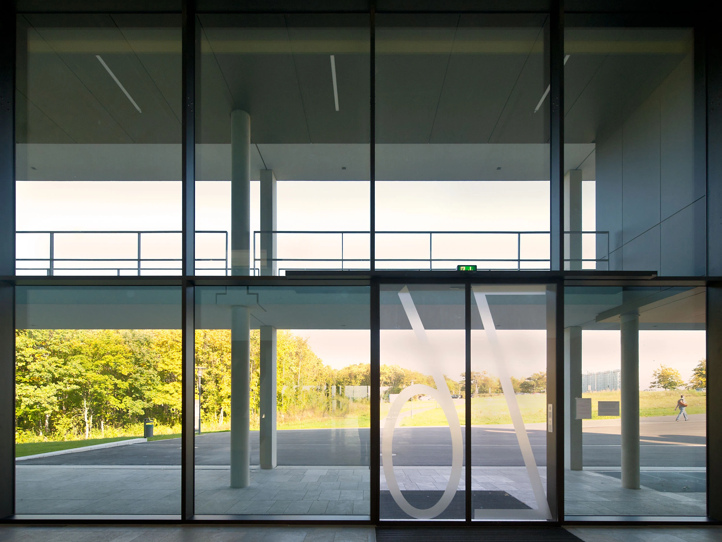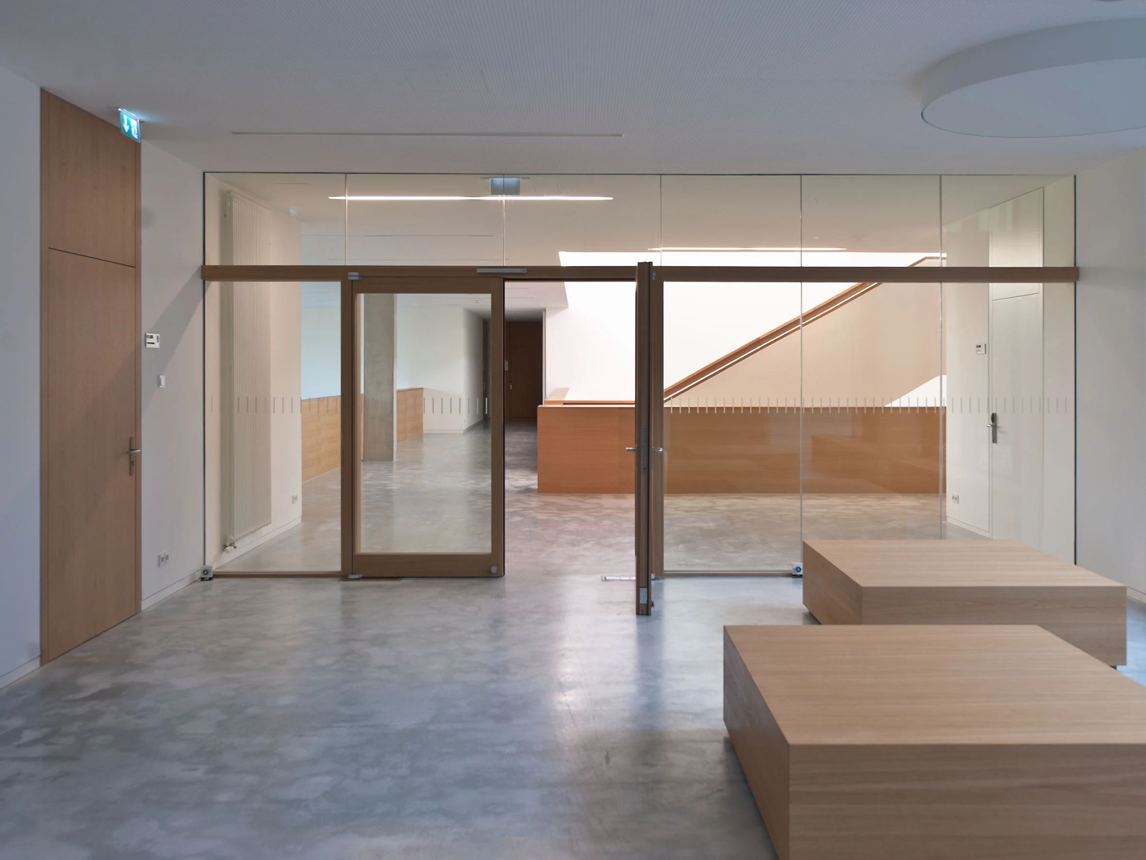 Das Gebäude wird nahezu gleichwertig von Osten und Westen erschlossen. Zwischen den Hörsälen im Erdgeschoss spannt sich ein großzügiges, nach oben offenes Foyer auf. In den beiden Obergeschossen orientieren sich die angrenzenden Aufenthaltsbereiche wechselseitig mit Blick auf den Campusweg und die Stadt. Die Flure der Obergeschosse werden über einen begrünten Innenhof natürlich belichtet und belüftet.