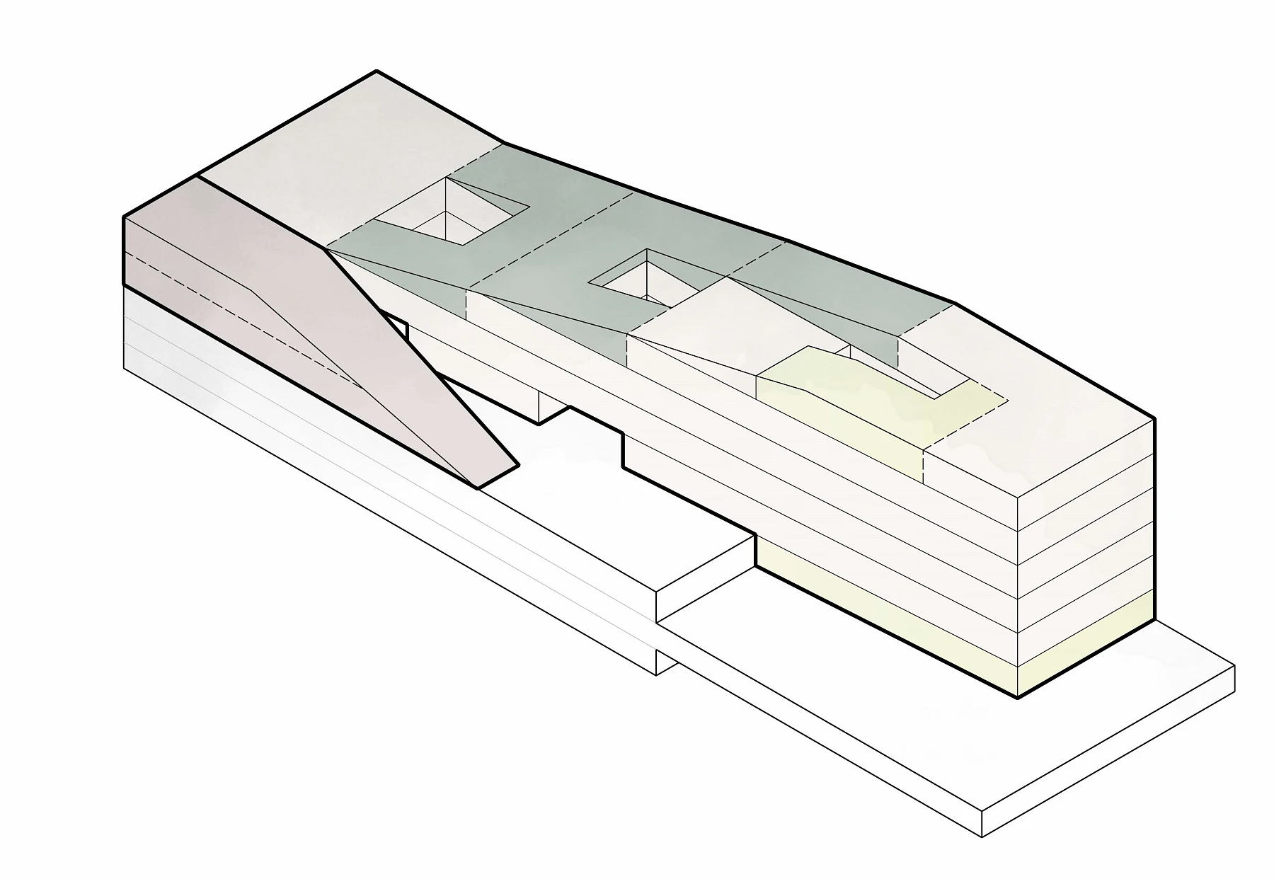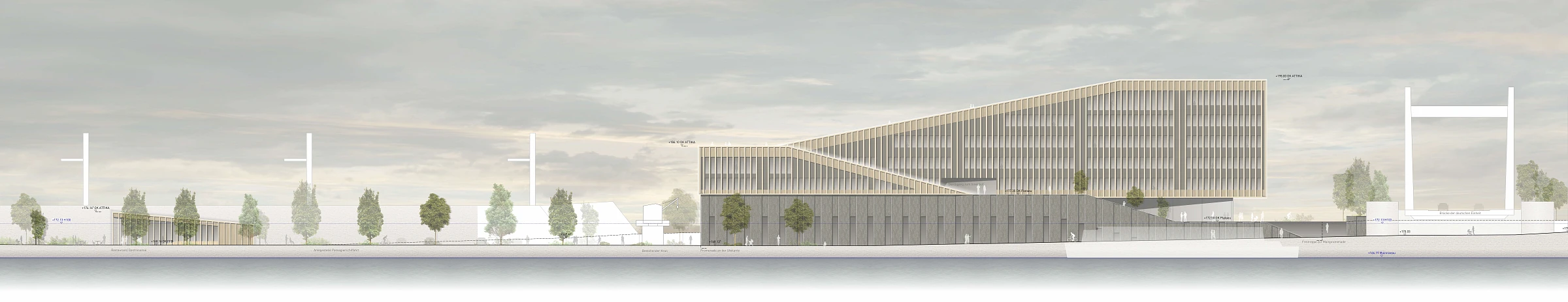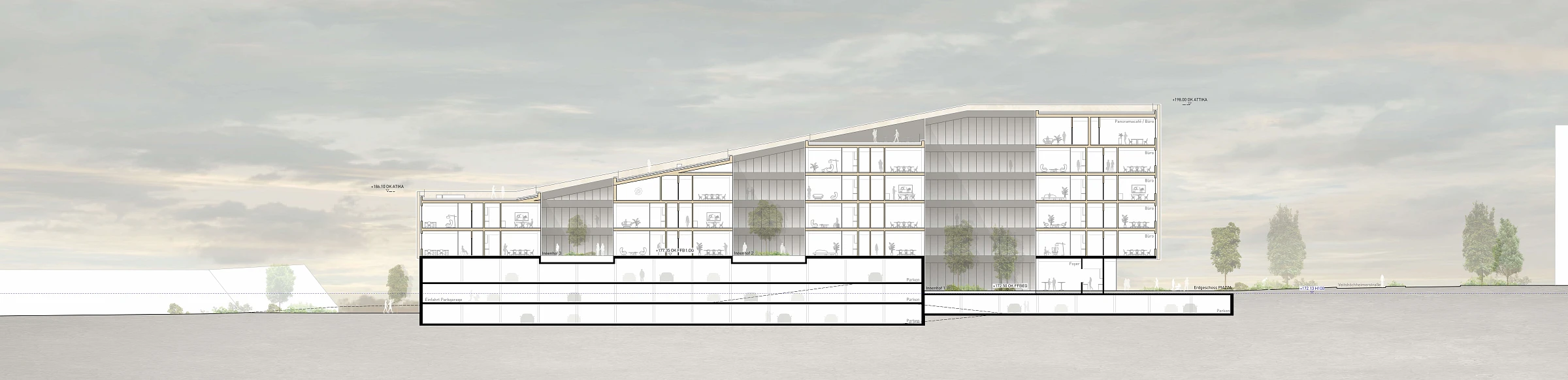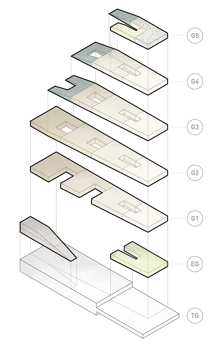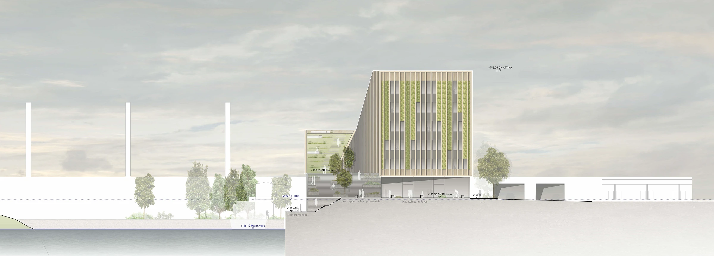 Der Baukörper bildet einen Kontrapunkt zum Brückenkopf und dem gegenüberstehenden Hotel und gleicht sich an der andere Grundstückskante dem Niveau der Bahntrasse an. Dieser Höhenverlauf wird nach unten erweitert und bildet einen fließenden Übergang zur tieferliegenden Uferpromenade. Der Baukörper ruht auf einem massiven Sockel, in dem der ruhende Verkehr platziert ist. Der aufgesetzte Holzbau türmt sich ähnlich einer Welle in Richtung Altstadt auf und bildet durch seine skulpturale Formensprache eine Landmarke und einen Abschluss der Mainpromenade Richtung Veitshöchheim. Durch die begehbaren geneigten Dachflächen werden unterschiedliche Plateauebenen ausgebildet, die ein abwechslungsreiches Angebote für Pausen, informelle Begegnungen bieten und zum Verweilen einladen. Transparente Eingänge, Foyers und Innenhöfe, verbinden die unterschiedlichen Nutzungseinheiten zu einem offenen, attraktiven, gesamtheitlich erlebbaren Gesamtkonzept.