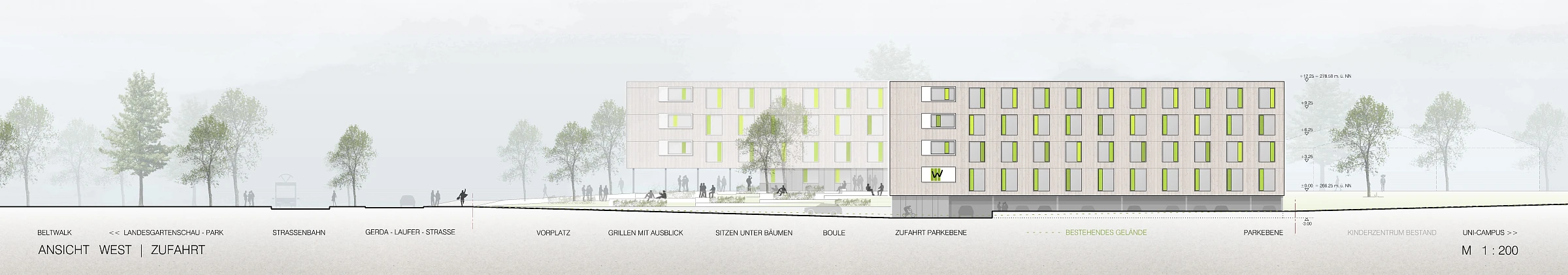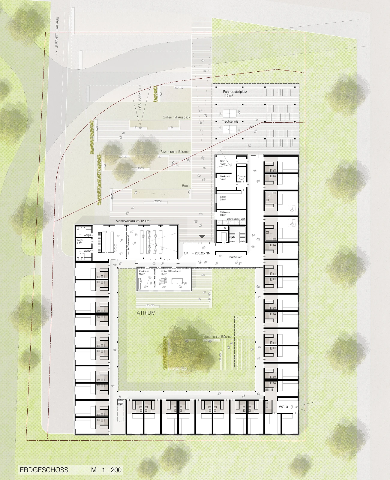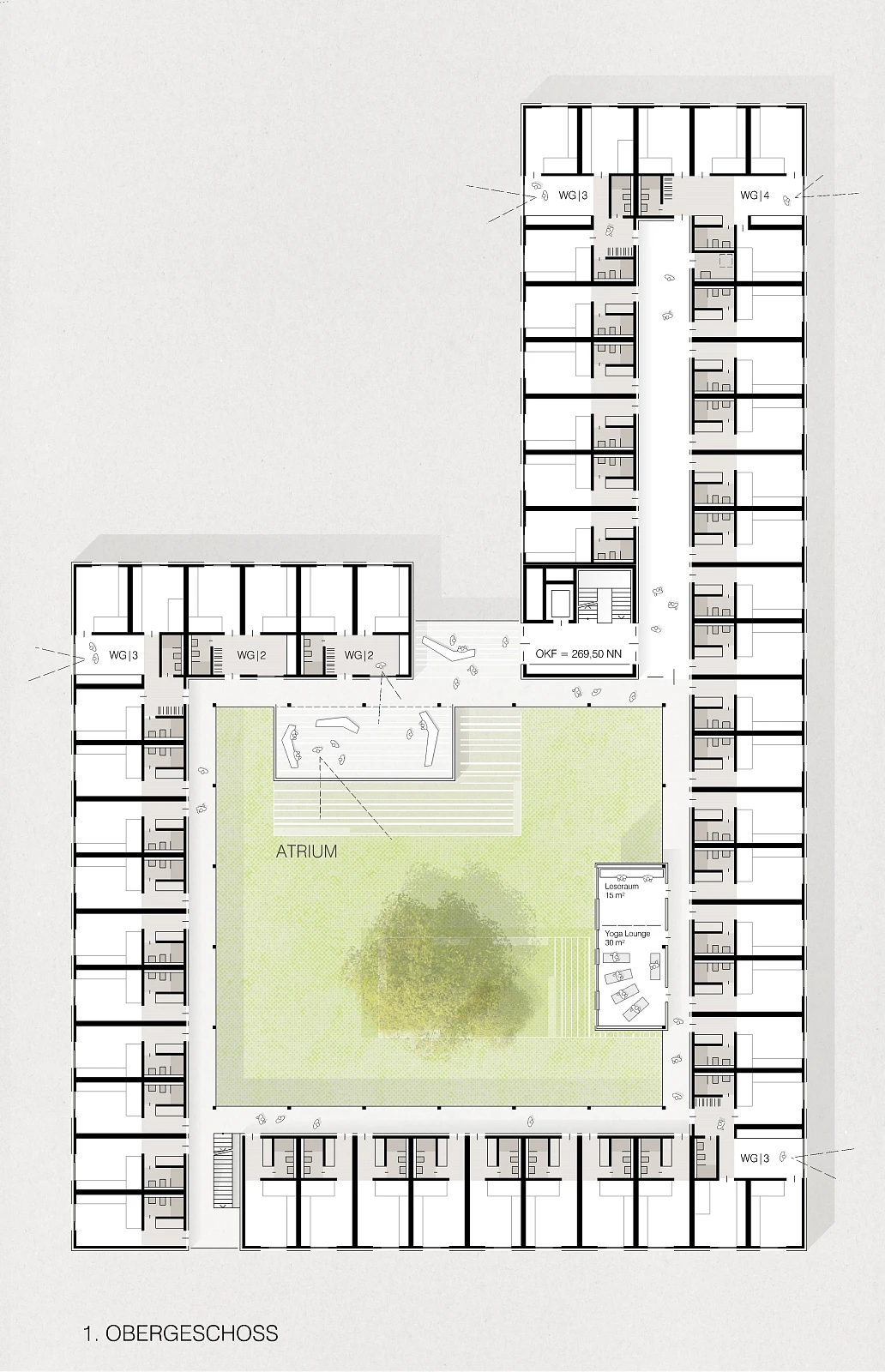 Der Eingang erschließt das Gebäude zentral, Laubengänge führen zu den einzelnen Studentenappartements. Die Orientierung im Wohnheim ist trotz der Anzahl der Wohneinheiten klar und übersichtlich. Der zentrale, das Gebäude beherrschende Erschließungsraum, verbindet, gliedert und dient der Kommunikation unter den Bewohnern. Die Gemeinschaftsräume im EG und 1.OG sind zur neuen Quatiersmitte als öffentliche Grünzone orientiert und bieten Raum für unterschiedliche Nutzungen.
