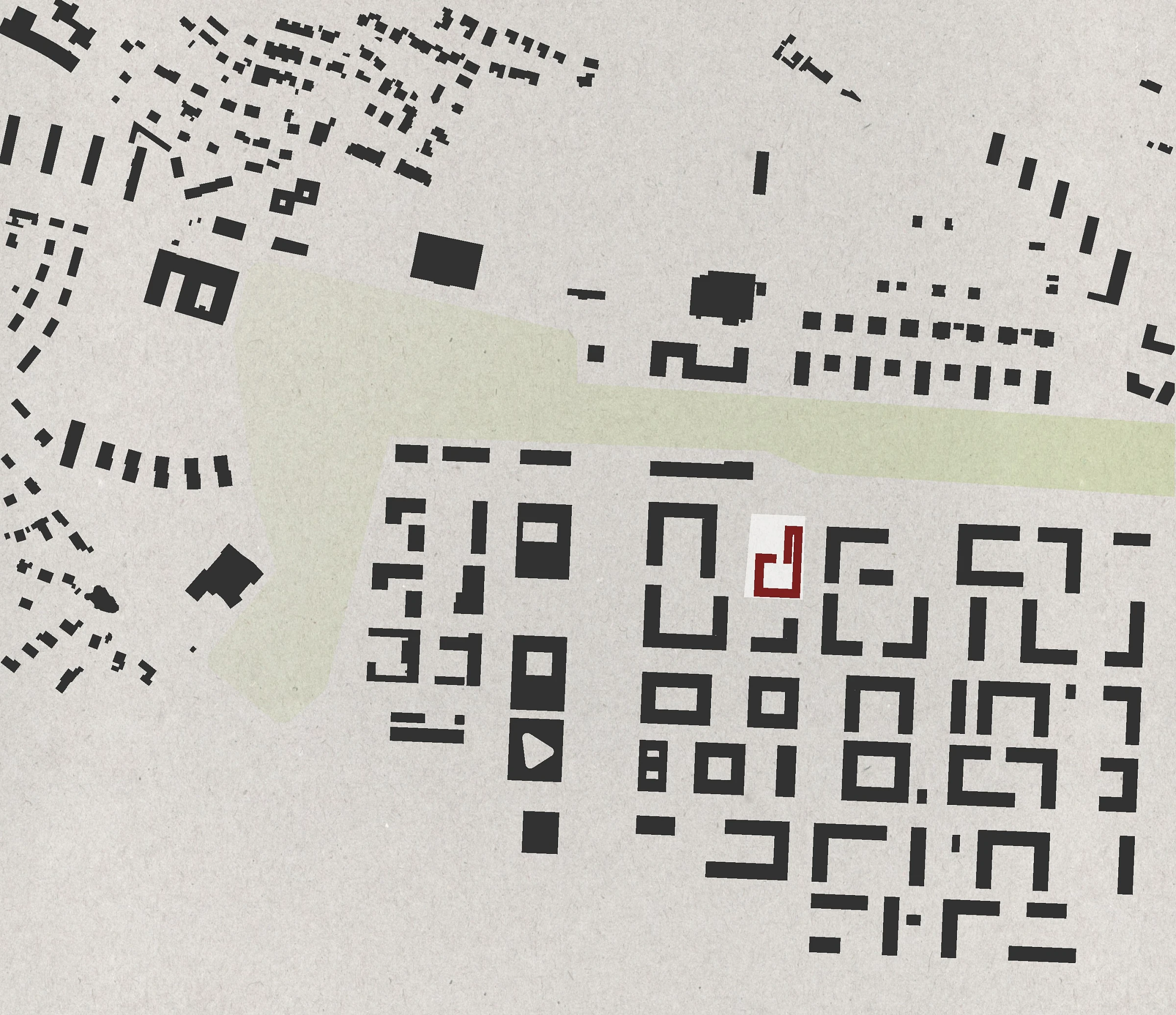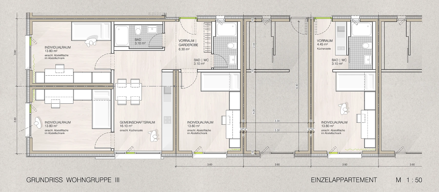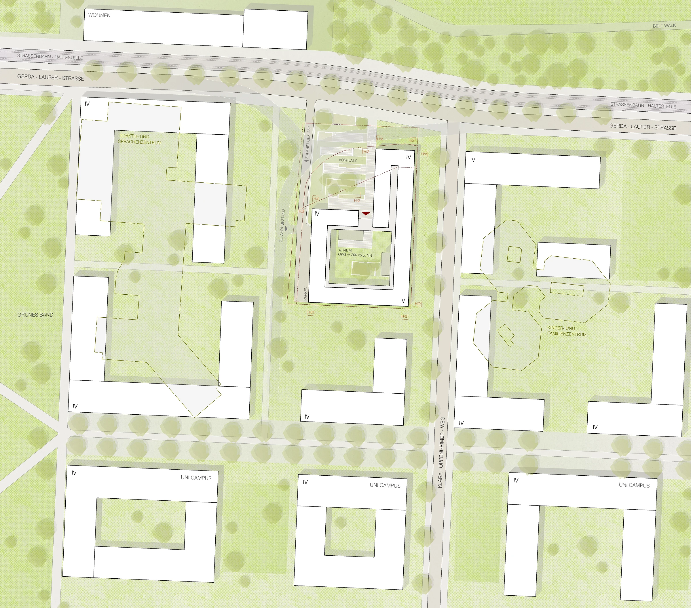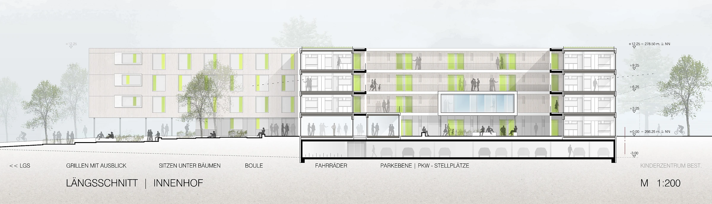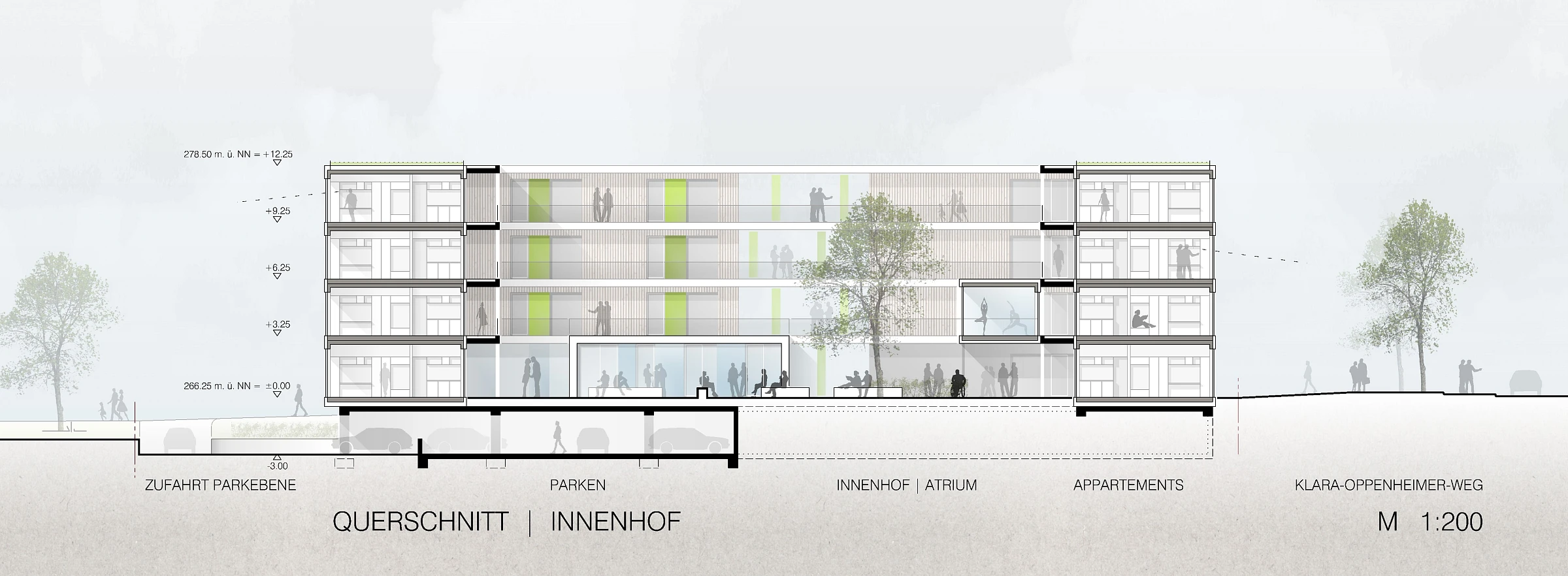 Zusammen mit dem Vorplatz ergibt sich eine spannende und mit dem Gesamtkonzept verträgliche Baukörperabfolge, die sich höhenmäßig ebenfalls in die Umgebung einfügt. Im introvertierten Innenhof entsteht ein ruhiger, geschützter, grüner Freiraum, der gemeinsame Aktivitäten der Bewohner und die interne Kommunikation fördert.