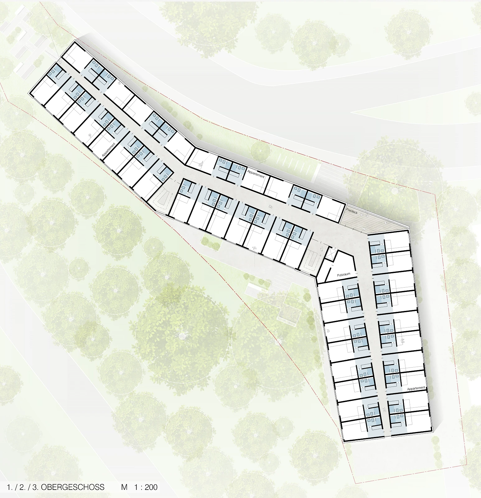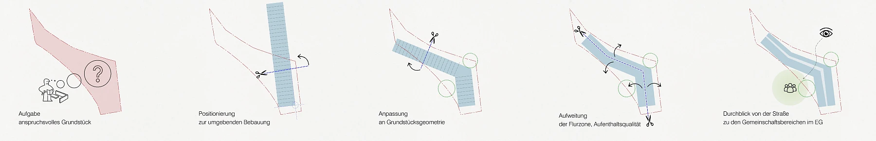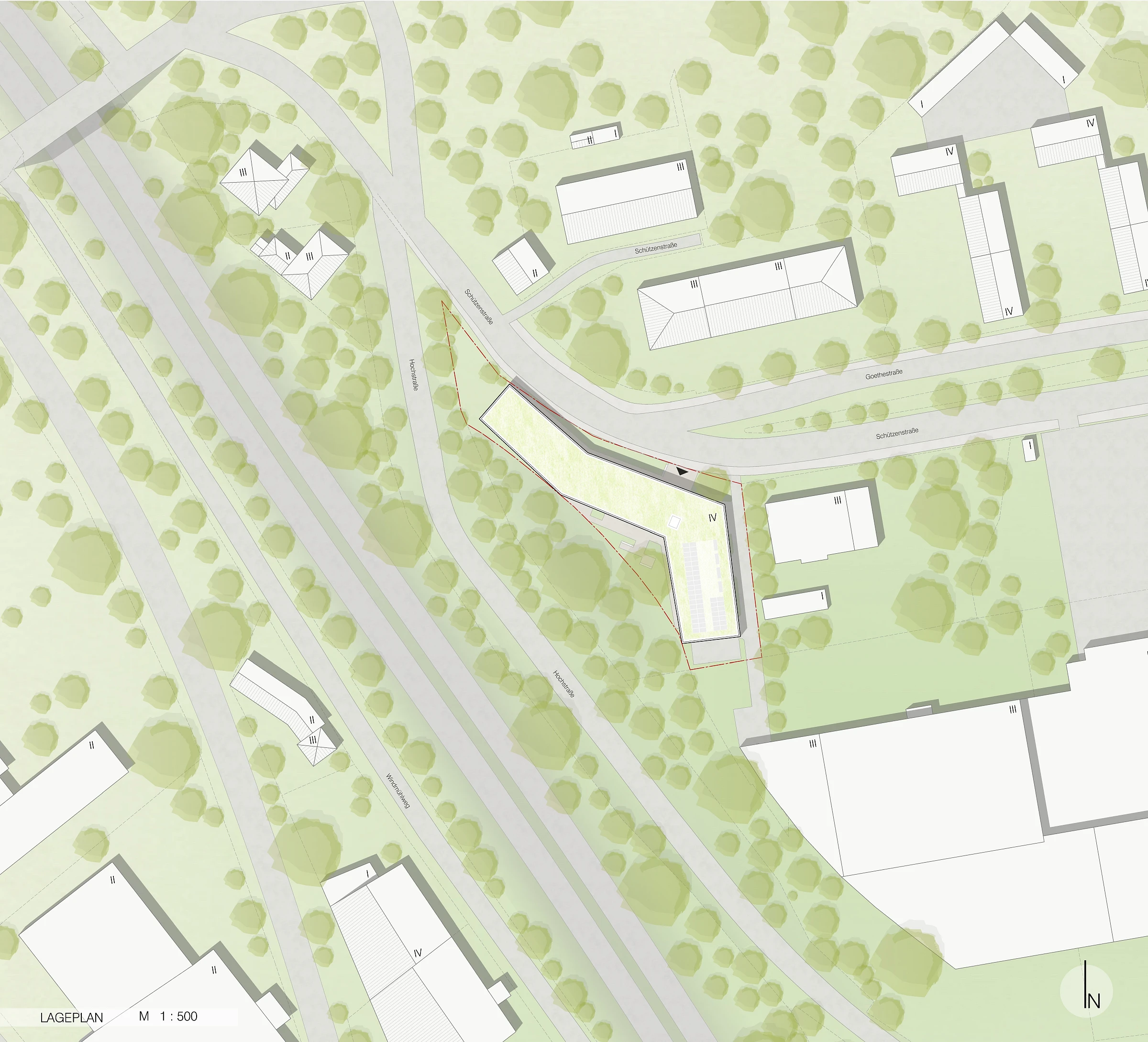 Das Wohnheim fügt sich durch seine Geometrie und Platzierung auf dem Grundstück in die heterogene städtebauliche Gesamtsituation mit unterschiedlichsten Baukörperformen ein. Es positioniert sich - der Schützenstraße folgend - entlang der polygonalen Grundstücksgrenzen und schafft einen geschützten Außenbereich in Richtung der stark durchgrünten Biotopfläche. Die nordöstliche Gebäudekante orientiert sich am angrenzendem Bestandsgebäude und schafft eine markante Adressbildung sowie eine einladende und gut erkennbare Eingangssituation. Durch die zurückspringenden Loggien in den Obergeschossen und die trichterförmige Gebäudezugang im Erdgeschoss erhält die Gebäudekante eine zusätzliche funktionale und gestalterische Qualität. Um die visuelle Verbindung zu den grünen Freiräumen unterhalb der Hochstraße zu erhalten, wird im Erdgeschoss eine transparente Erschließungsachse geschaffen.