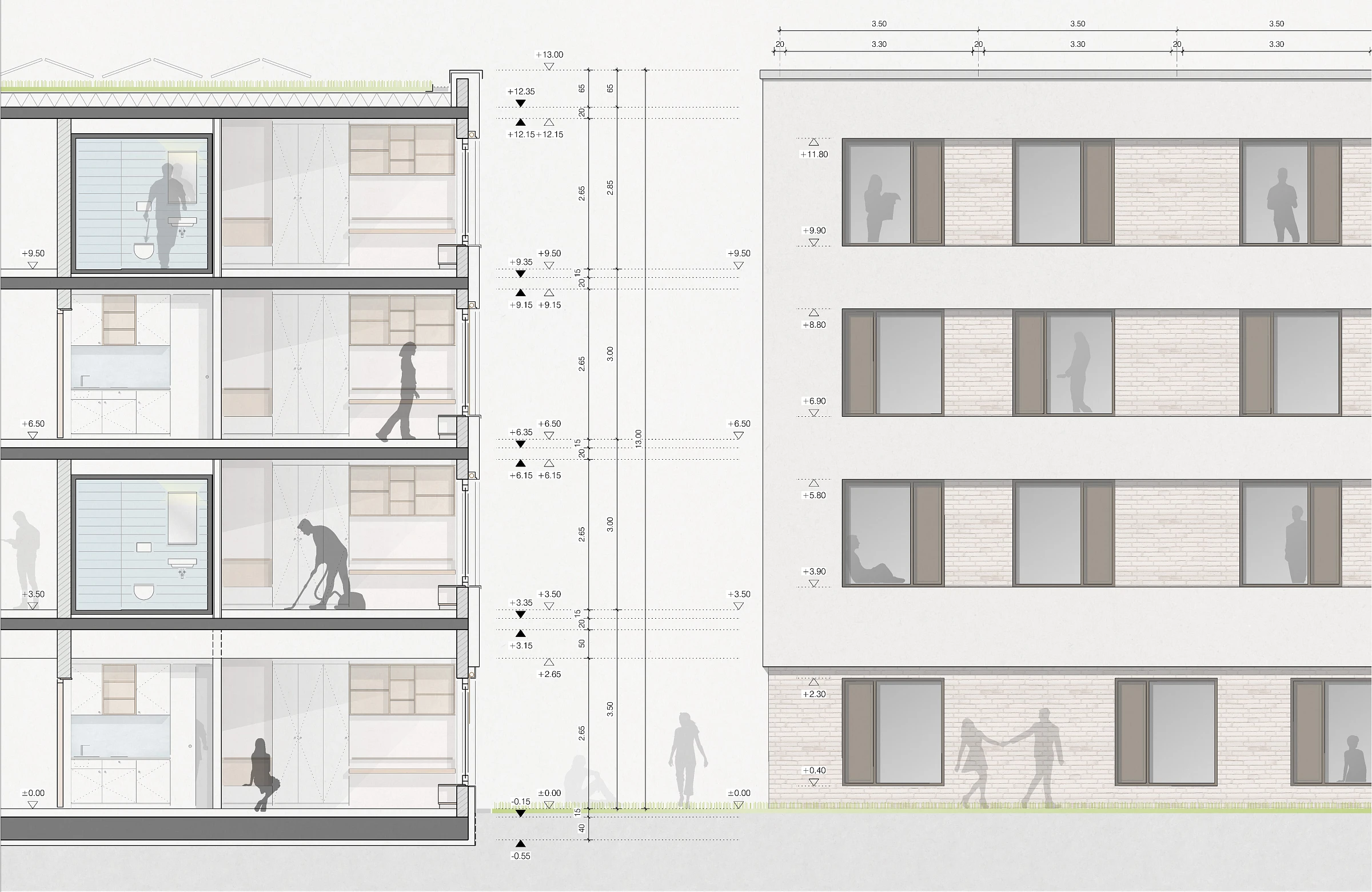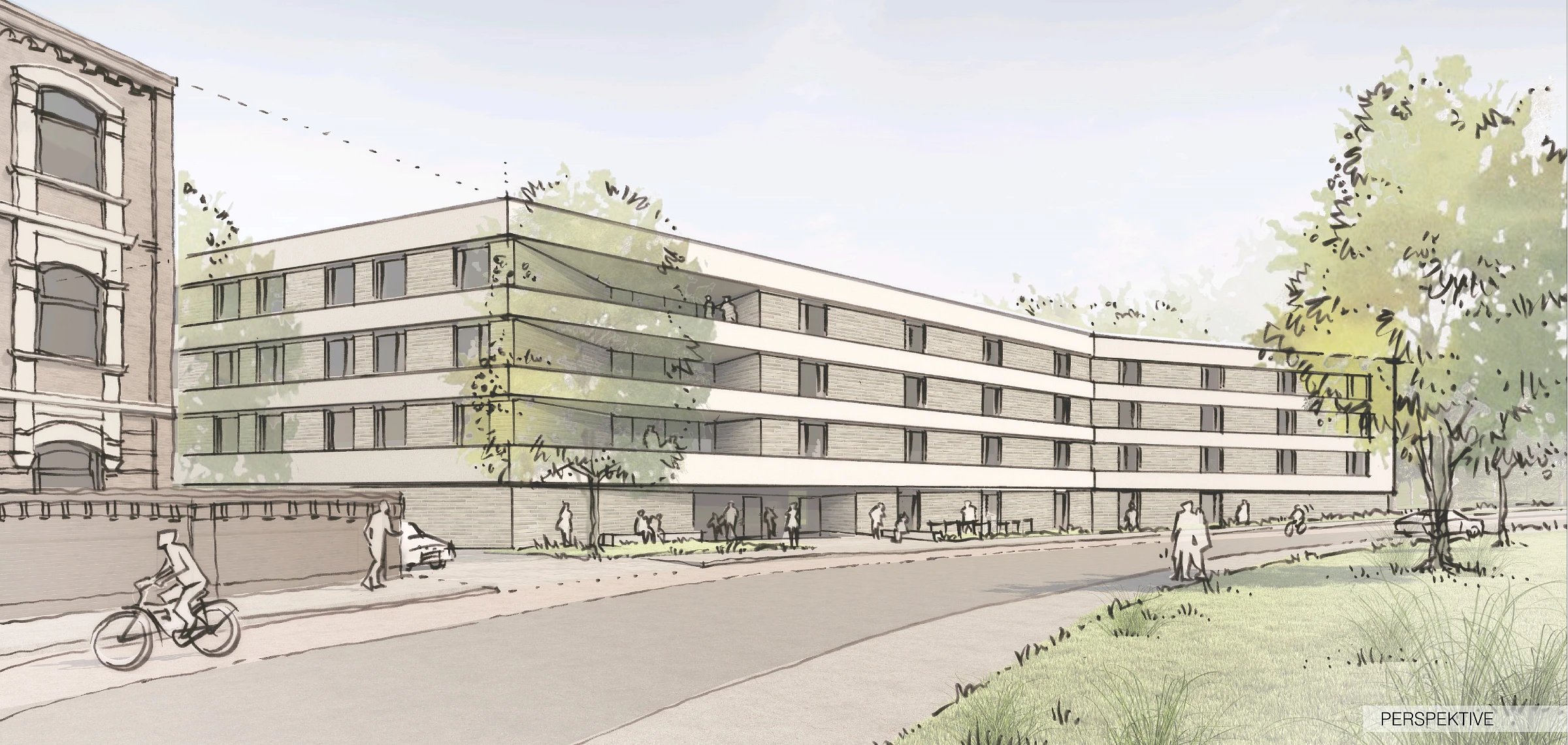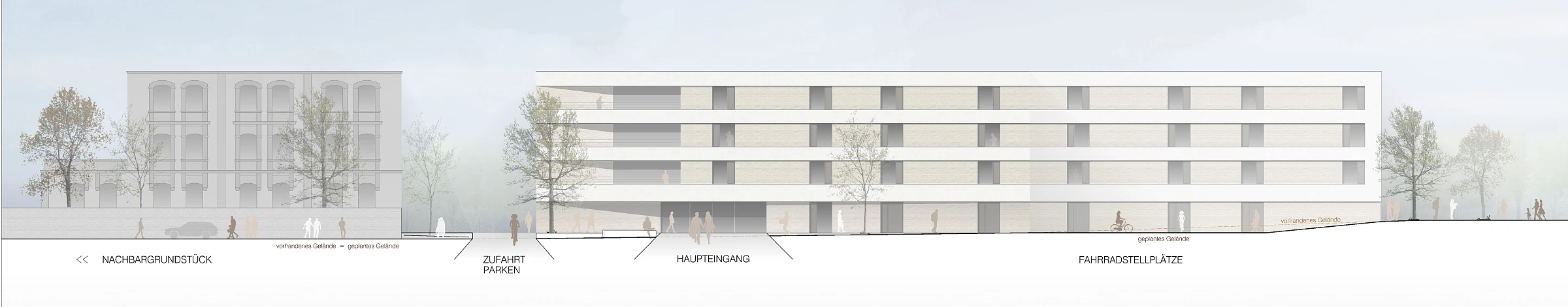 Das Wohnheim fügt sich durch seine Geometrie und Platzierung auf dem Grundstück in die heterogene städtebauliche Gesamtsituation mit unterschiedlichsten Baukörperformen ein. Es positioniert sich - der Schützenstraße folgend - entlang der polygonalen Grundstücksgrenzen und schafft einen geschützten Außenbereich in Richtung der stark durchgrünten Biotopfläche. Die nordöstliche Gebäudekante orientiert sich am angrenzendem Bestandsgebäude und schafft eine markante Adressbildung sowie eine einladende und gut erkennbare Eingangssituation. Durch die zurückspringenden Loggien in den Obergeschossen und die trichterförmige Gebäudezugang im Erdgeschoss erhält die Gebäudekante eine zusätzliche funktionale und gestalterische Qualität. Um die visuelle Verbindung zu den grünen Freiräumen unterhalb der Hochstraße zu erhalten, wird im Erdgeschoss eine transparente Erschließungsachse geschaffen.
