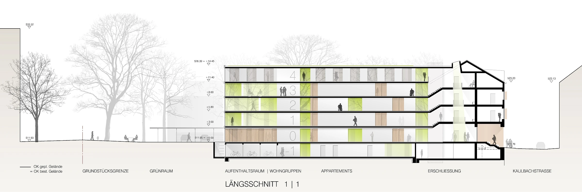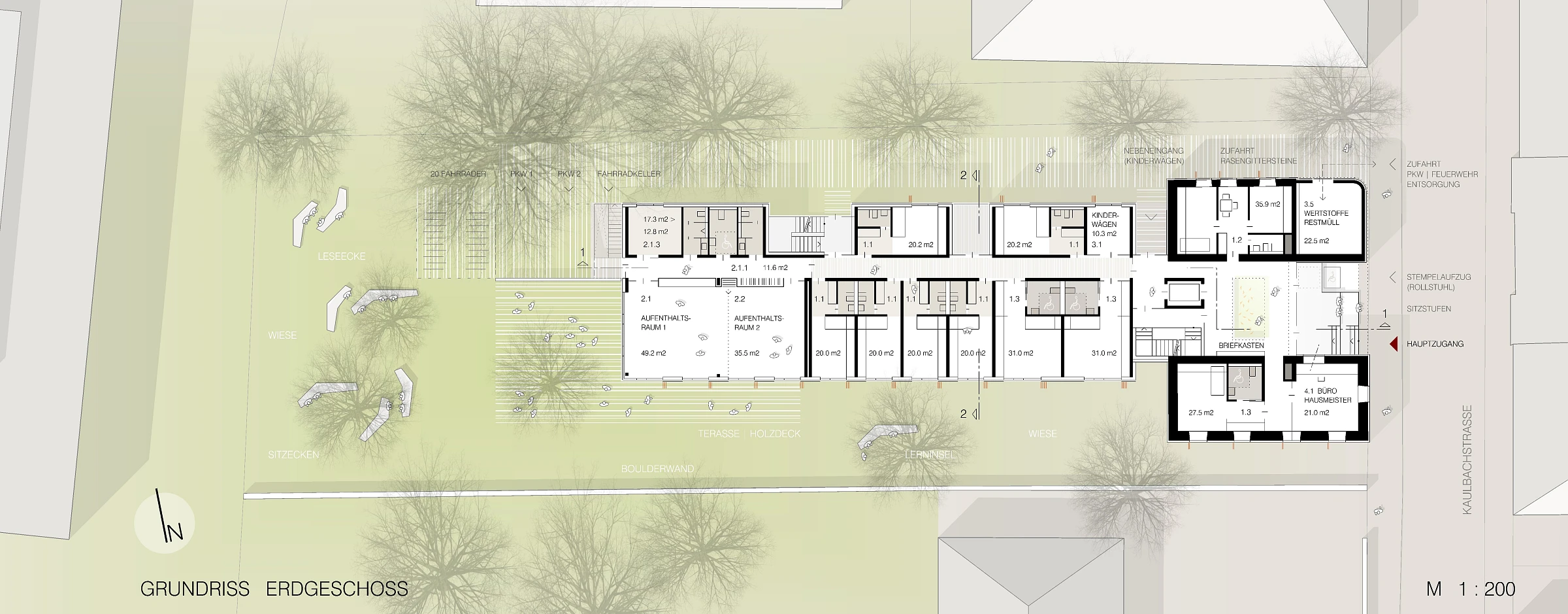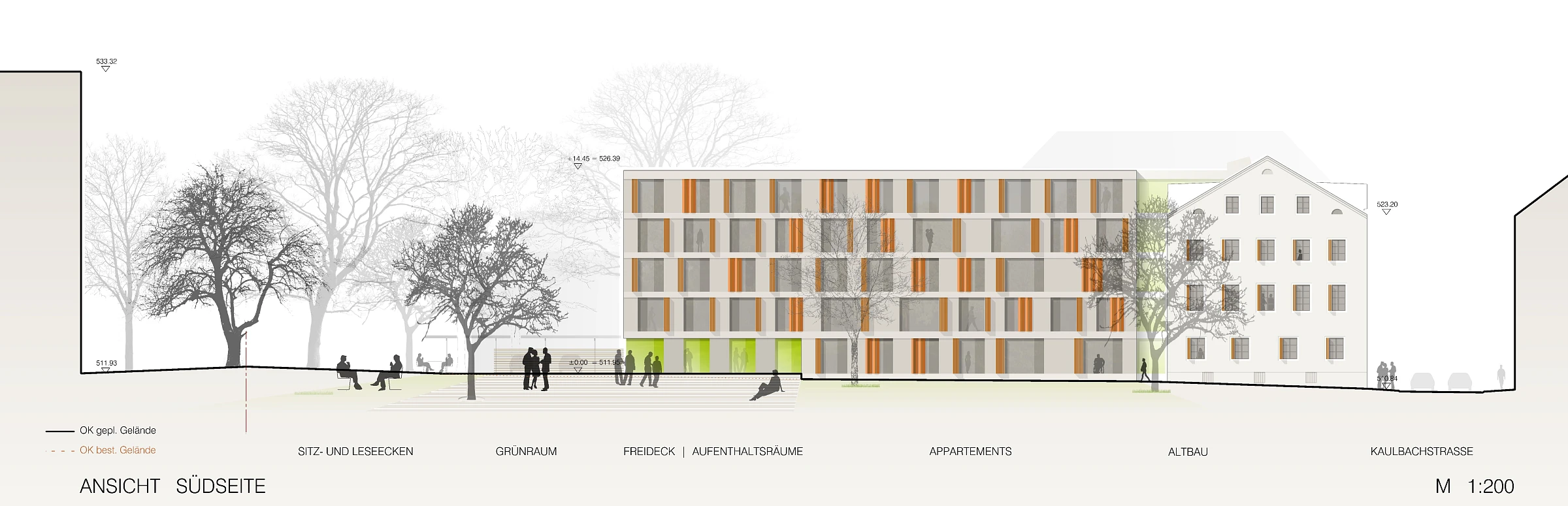 Die Studentenappartements sind fast ausschließlich in den ruhigen Grünraum nach Süden orientiert und lassen eine hohe Aufenthaltsqualität erwarten. Der nördlich angelegte Weg dient der Erschließung für Fahrräder und Rollstuhlfahrer (im PKW) ohne Störung der Individualräume. Die Gemeinschaftsräume im EG sind nach Südwesten zur Grünfläche orientiert und bieten Raum für unterschiedliche Nutzungen.Die klare Baustruktur wird auch in der Fassadenanordnung sichtbar. Alt- und Neubau treten in Dialog zueinander und fügen sich zu einem harmonischen Gesamtvolumen.