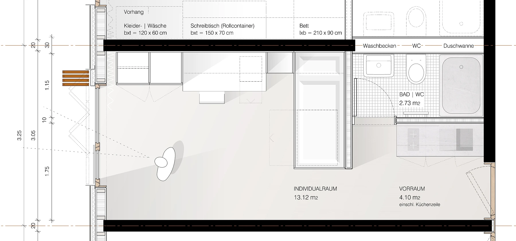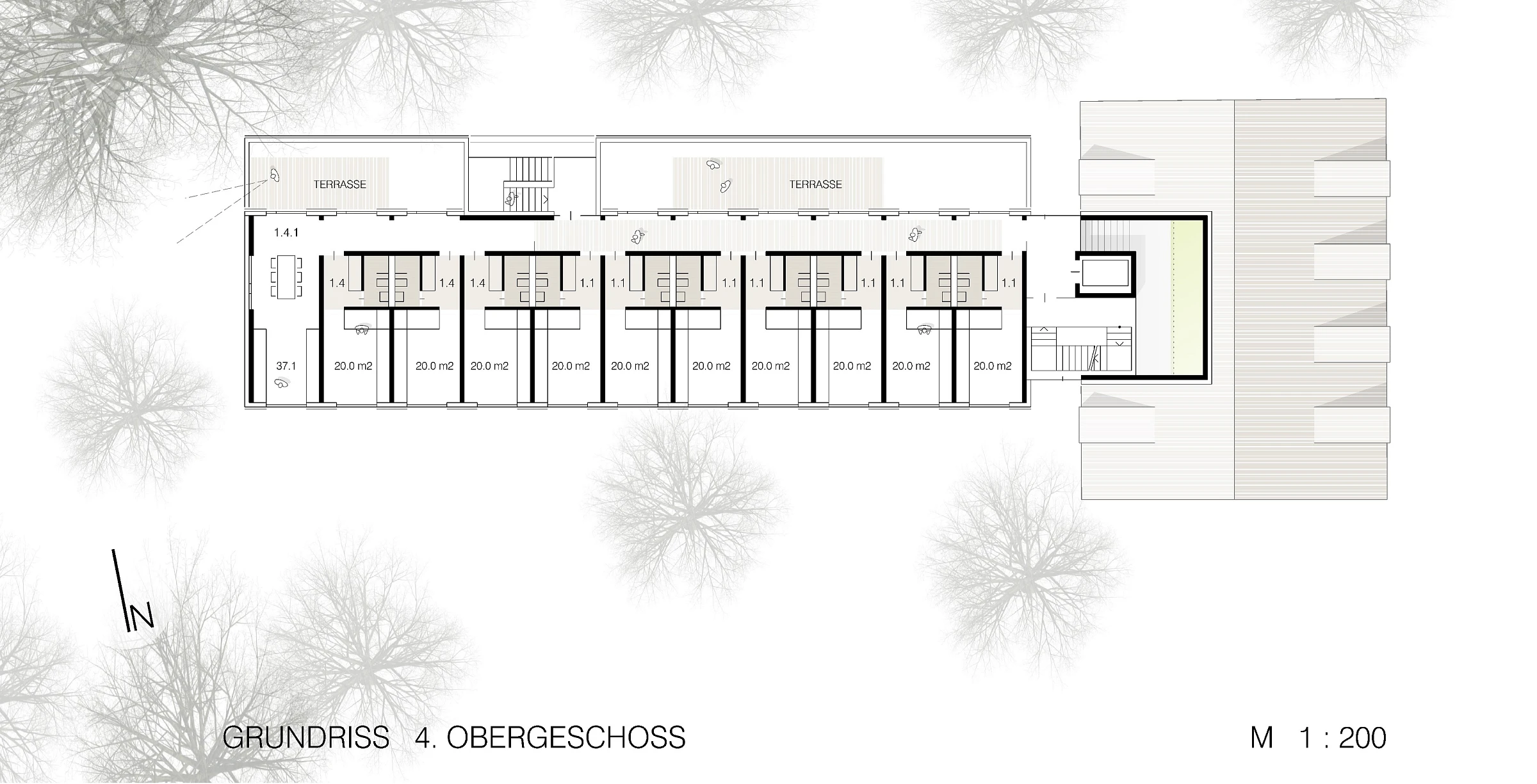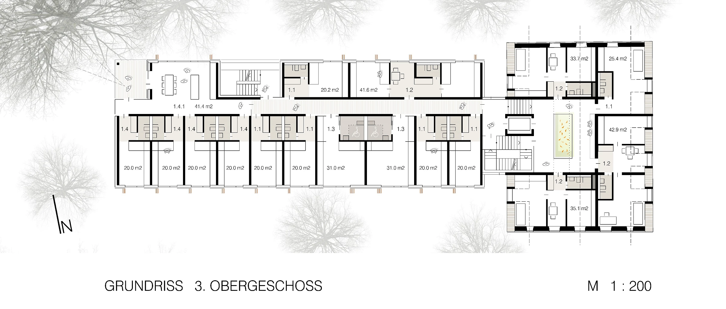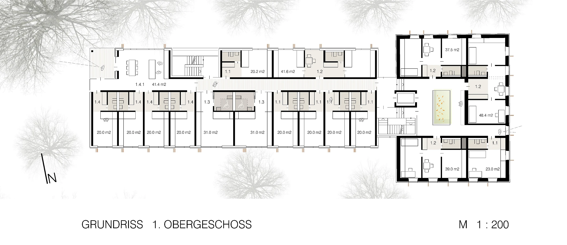 Die Studentenappartements sind fast ausschließlich in den ruhigen Grünraum nach Süden orientiert und lassen eine hohe Aufenthaltsqualität erwarten. Der nördlich angelegte Weg dient der Erschließung für Fahrräder und Rollstuhlfahrer (im PKW) ohne Störung der Individualräume. Die Gemeinschaftsräume im EG sind nach Südwesten zur Grünfläche orientiert und bieten Raum für unterschiedliche Nutzungen.Die klare Baustruktur wird auch in der Fassadenanordnung sichtbar. Alt- und Neubau treten in Dialog zueinander und fügen sich zu einem harmonischen Gesamtvolumen.
