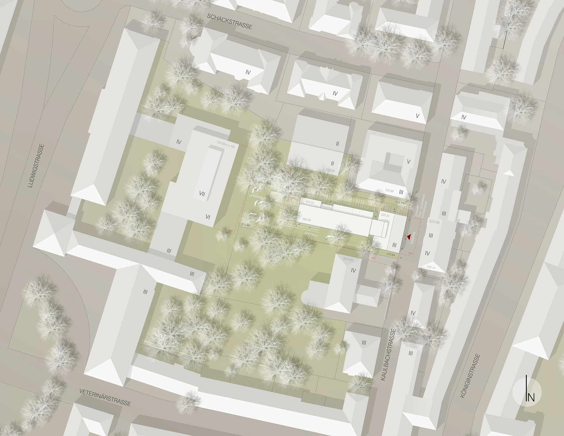 Der Bestand des Studentenwohnheims wird aufgenommen und neu organisiert. Durch die Umstrukturierung erhält das Gesamtprojekt eine neue "Adresse"; einen neuen Hauptzugang von der Kaulbachstraße. Der Eingang führt durch den jetzt von oben lichtdurchfluteten Kern des Altbaus in den zentralen Erschließungskern. An der Schnittstelle zwischen Alt- und Neubau befinden sich der Aufzug und die vierläufige Treppe, die die unterschiedlichen Geschosshöhen in den Gebäuden verbinden. Die Orientierung im Wohnheim ist klar und übersichtlich.