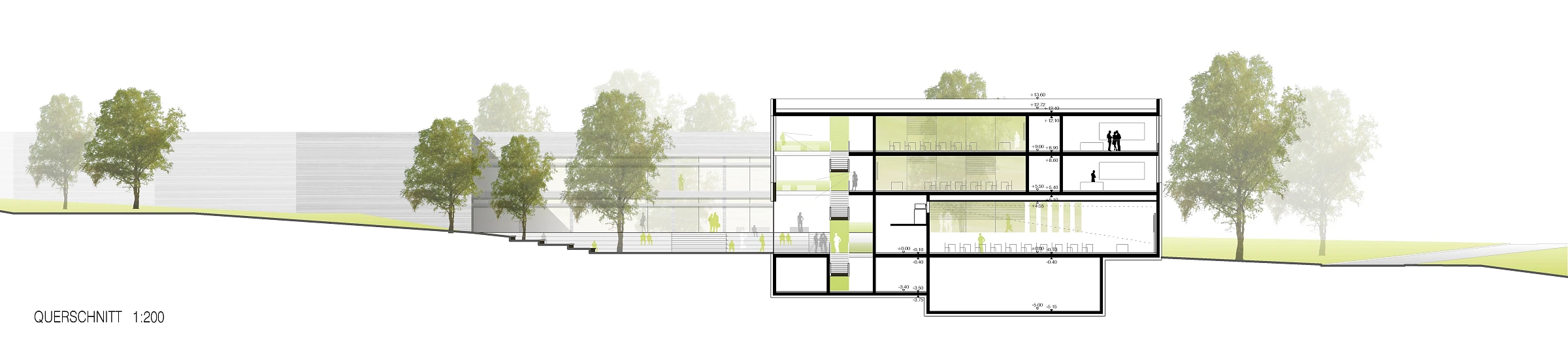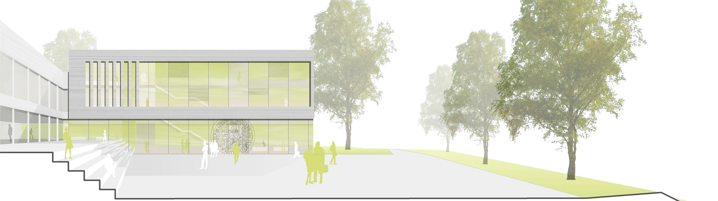 Es entsteht ein differenziert zonierter und variabel gestaltbarer „Foyer-Weg“. Das neue Haus ist jedoch für Tagungen/Messen/etc. als eigenständiger Solitär erkennbar und über den gemeinsamen Vorhof eigenständig erschlossen.