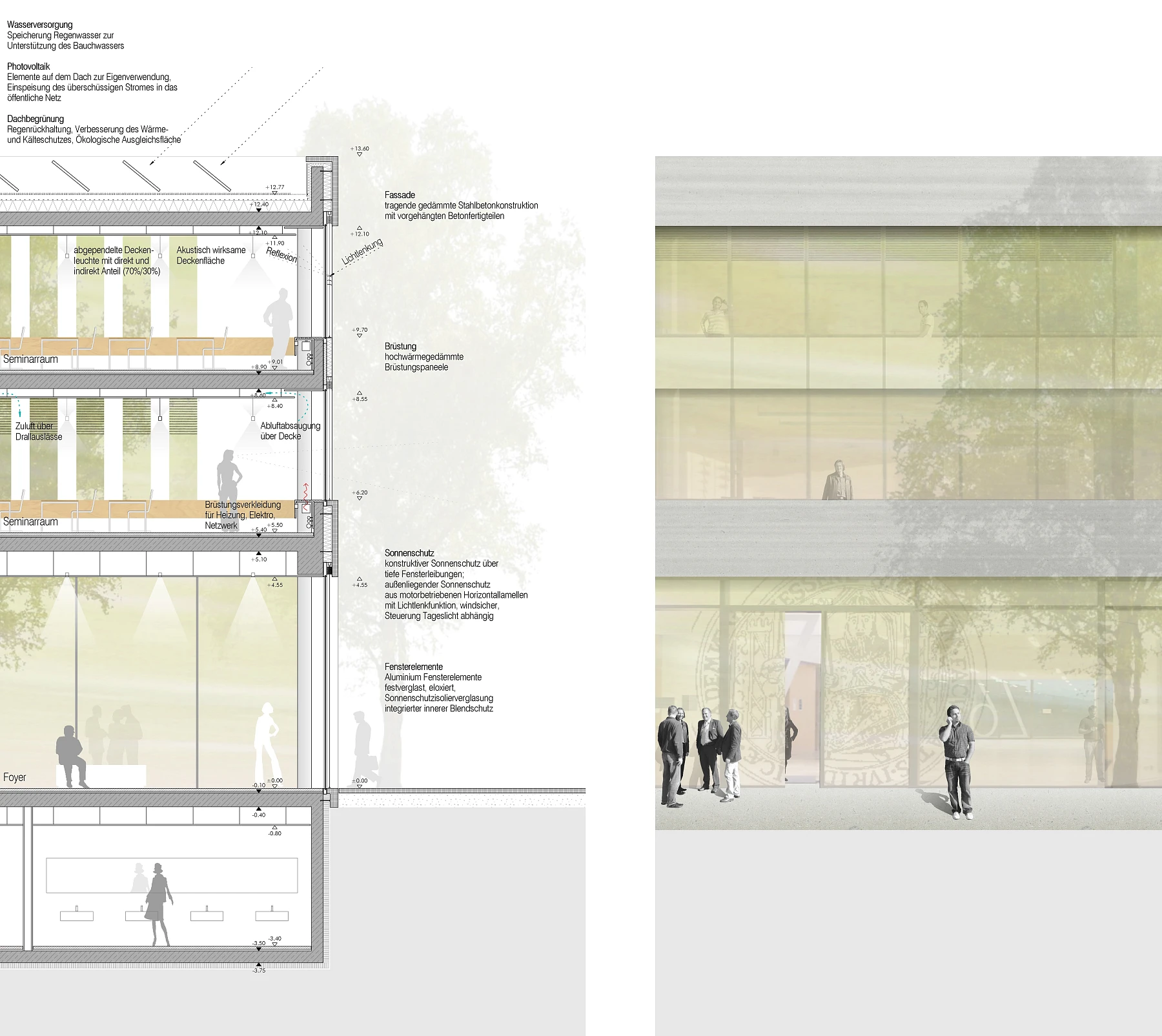 Der große Hörsaal wird – auch in der Teilungsvariante – über die Längsseiten ausführlich mit Licht versorgt. Die Seminarräume erhalten mit geringer Tiefe einen hohen Fassadenanteil. Die Räume sind auch für die Teilungsoption ausgewogen proportioniert.