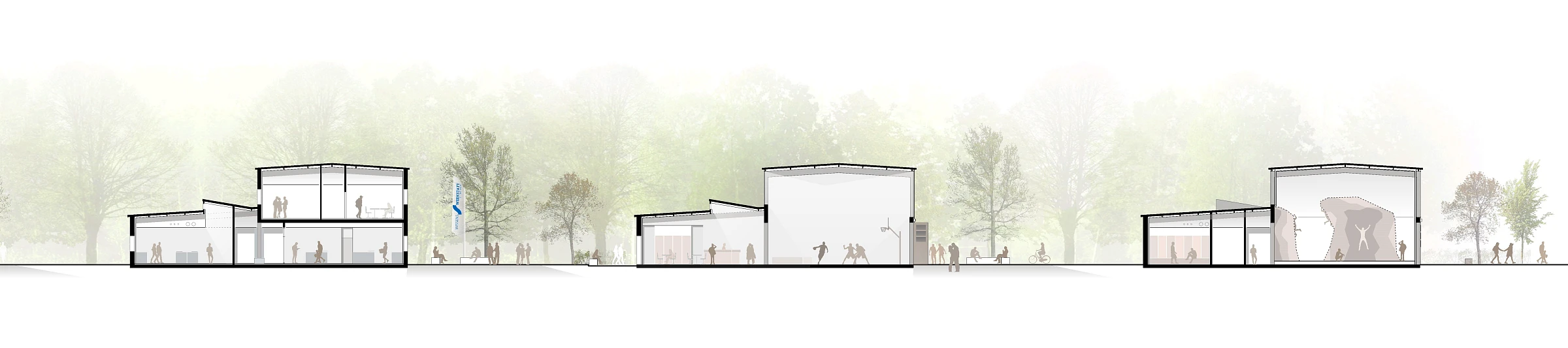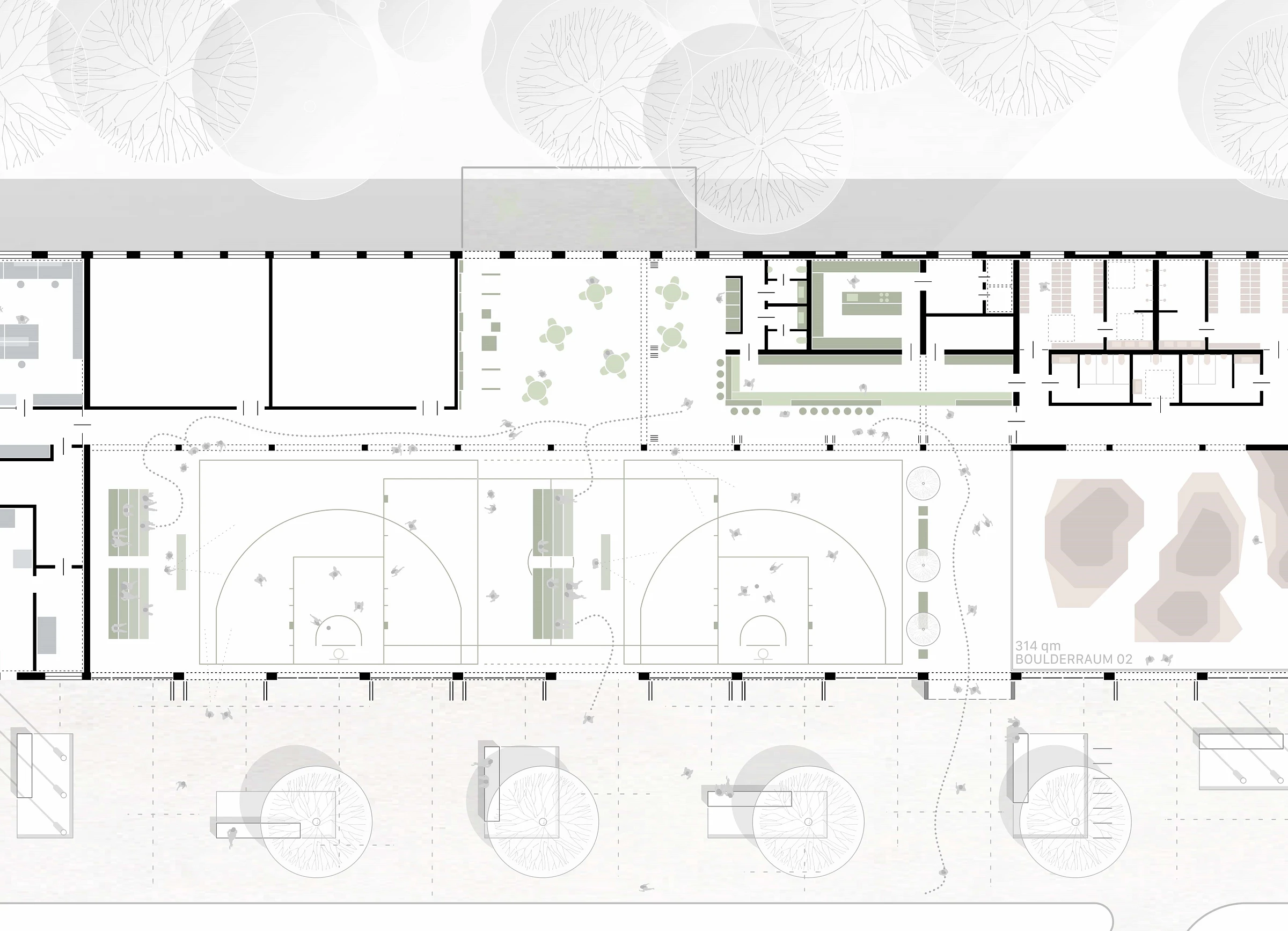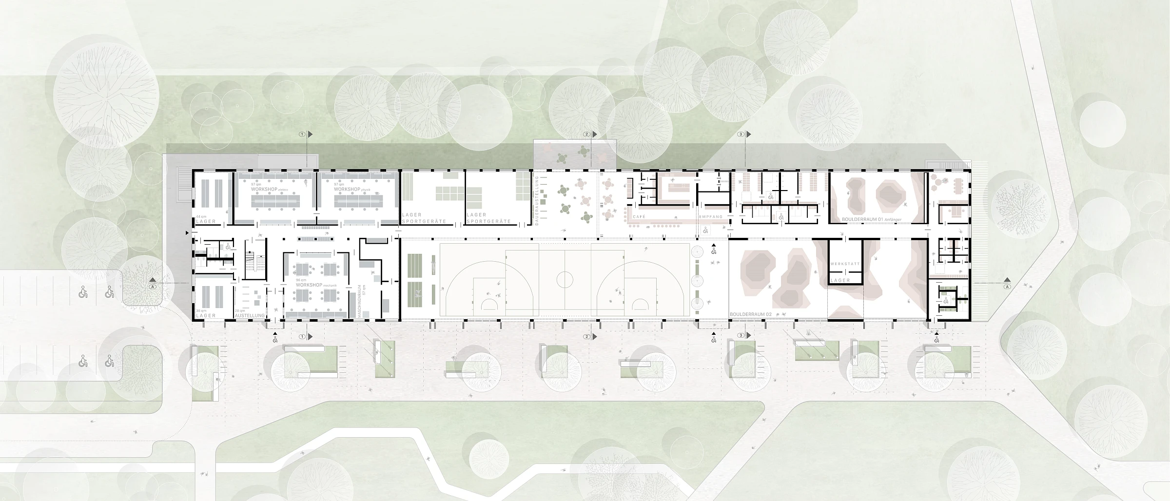 Die Multifunktionshalle dient als überdachte, barrierefreie Sport- und Freizeitfläche und bildet damit die Hauptnutzung des Projekts. Gleichzeitig bietet sie einen flexiblen Raum für vielfältige Sondernutzungsszenarien, der sich an unterschiedliche Anforderungen und Veranstaltungen anpassen lässt. Durch die großzügige Öffnung der Falttüren kann der Innenraum zur angrenzenden Parkfläche hin erweitert werden, wodurch fließende Übergänge von innen nach außen entstehen. Dies verleiht der Halle einen einladenden Charakter und schafft eine offene, kommunikative Atmosphäre, die auch Spazierende zum Verweilen einlädt.