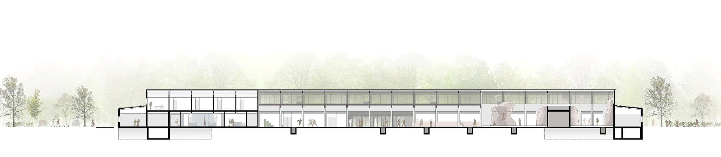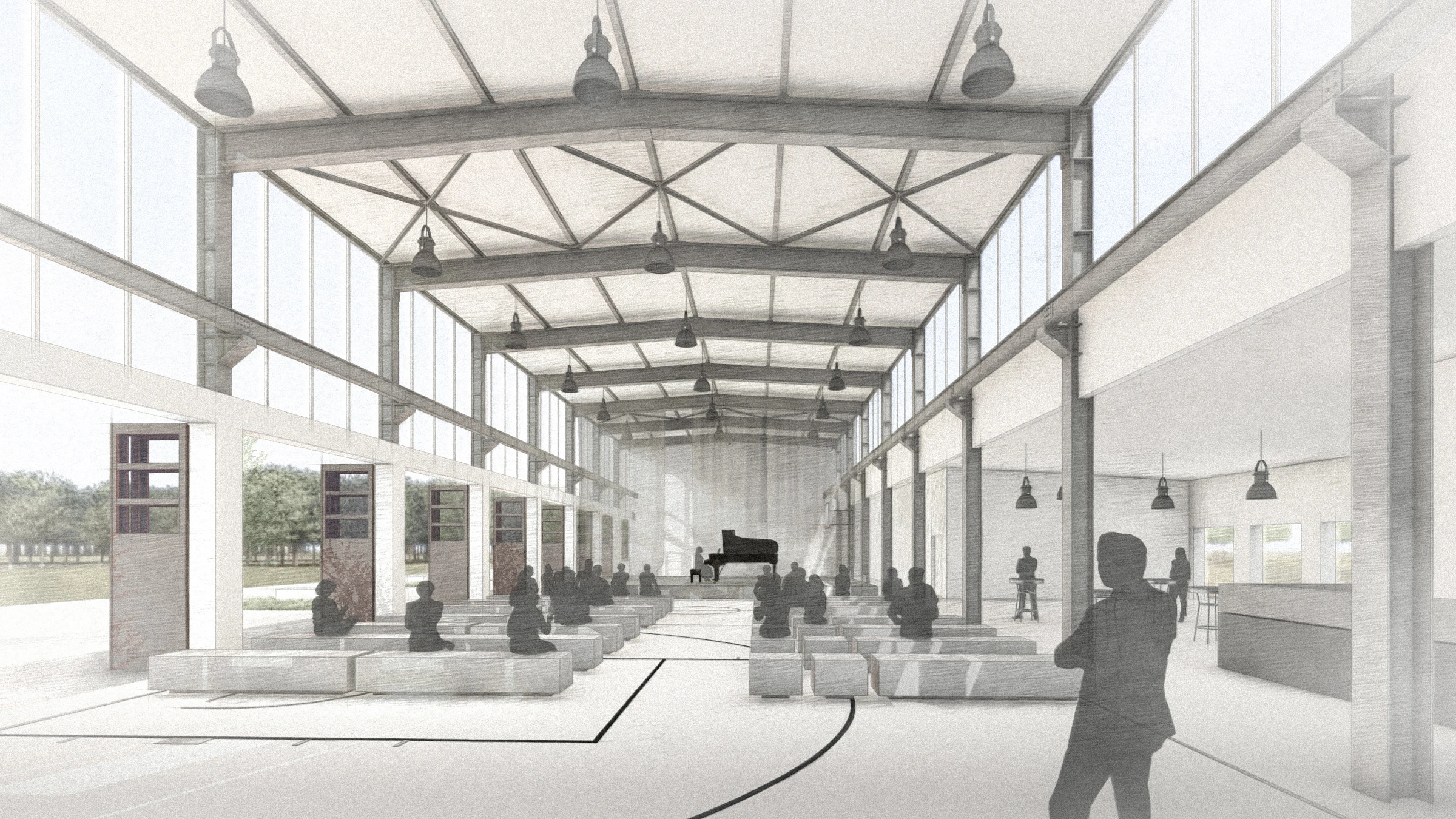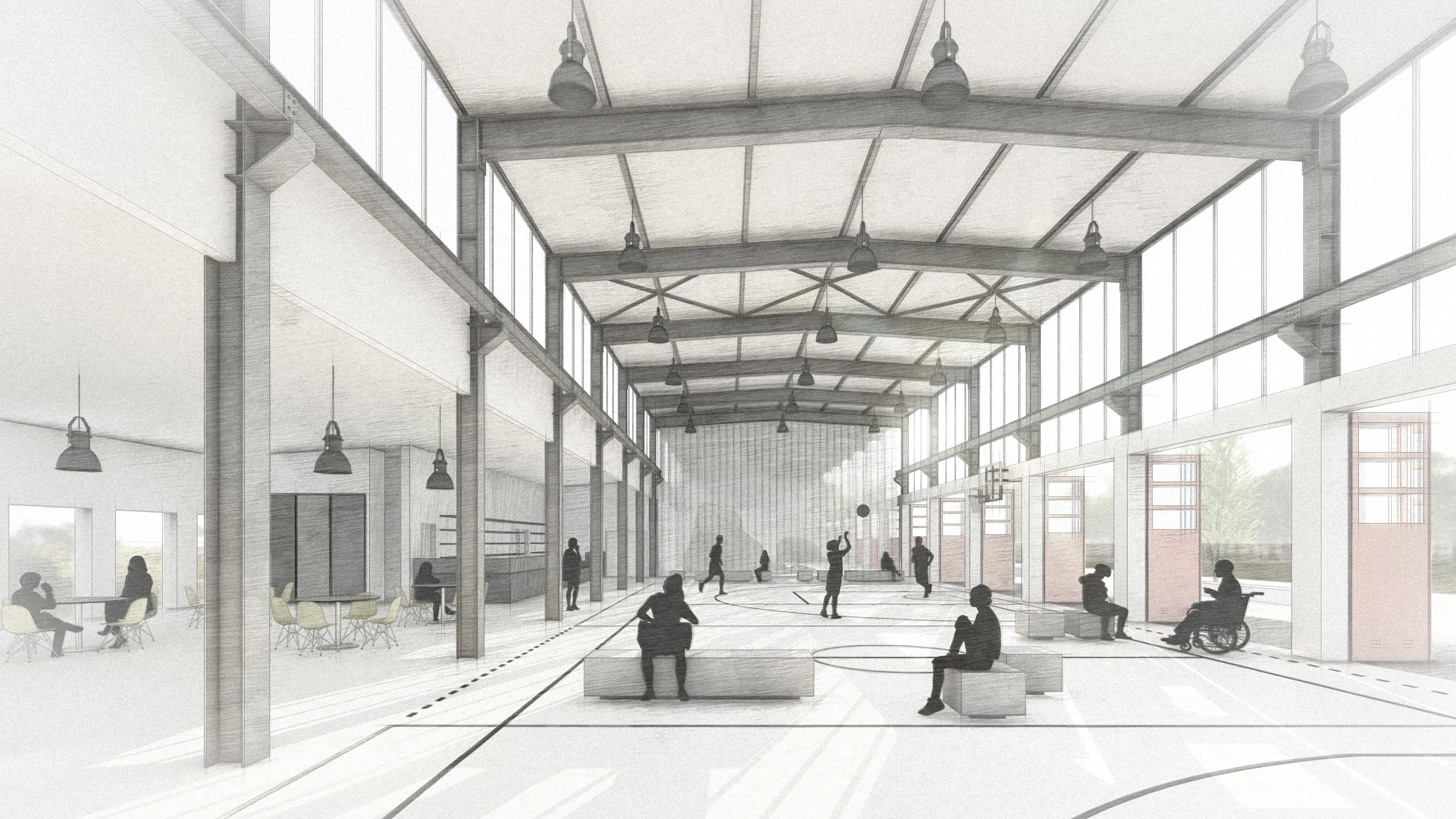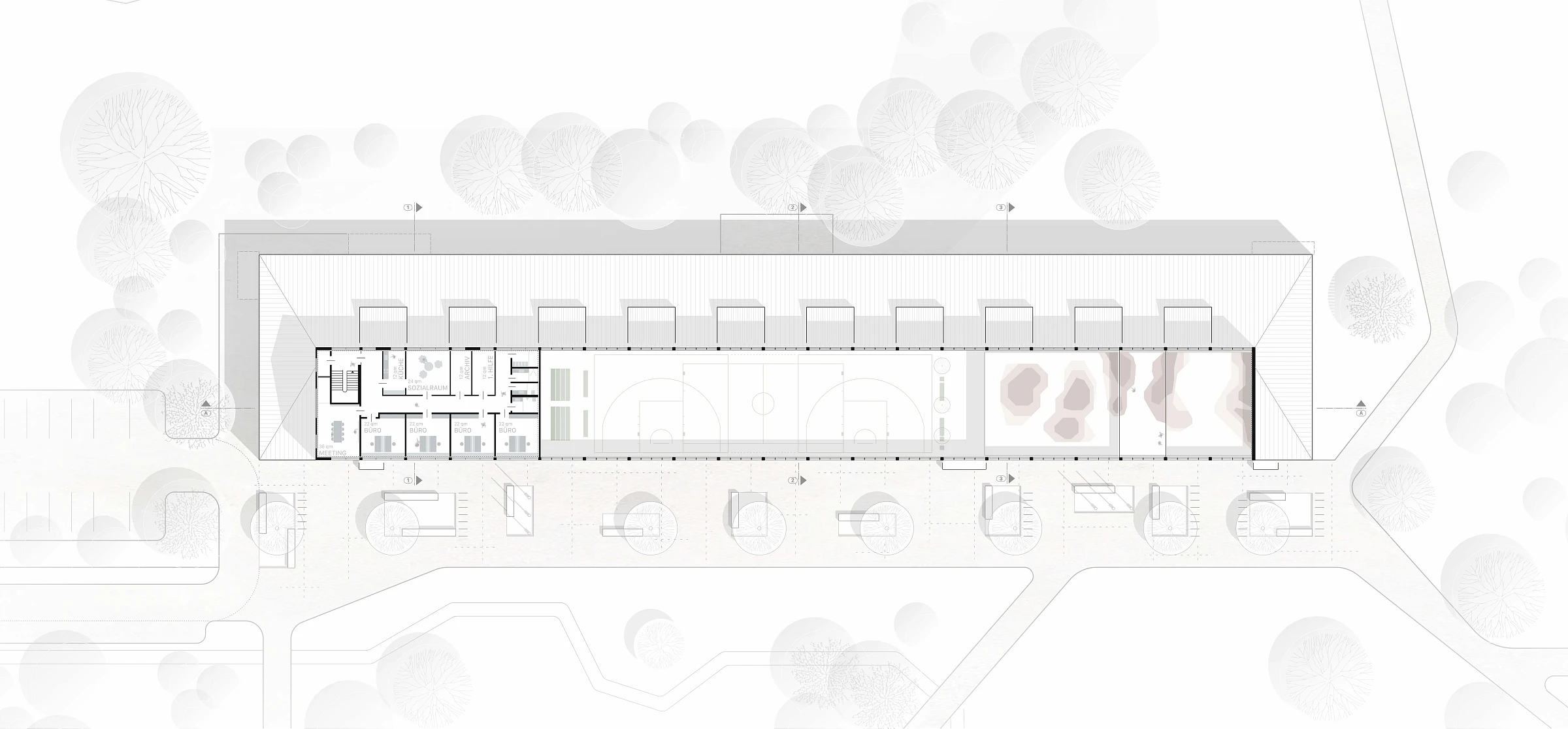 Die Multifunktionshalle dient als überdachte, barrierefreie Sport- und Freizeitfläche und bildet damit die Hauptnutzung des Projekts. Gleichzeitig bietet sie einen flexiblen Raum für vielfältige Sondernutzungsszenarien, der sich an unterschiedliche Anforderungen und Veranstaltungen anpassen lässt. Durch die großzügige Öffnung der Falttüren kann der Innenraum zur angrenzenden Parkfläche hin erweitert werden, wodurch fließende Übergänge von innen nach außen entstehen. Dies verleiht der Halle einen einladenden Charakter und schafft eine offene, kommunikative Atmosphäre, die auch Spazierende zum Verweilen einlädt.