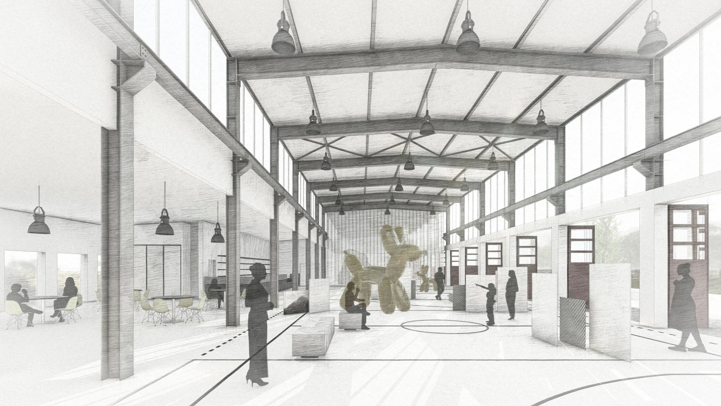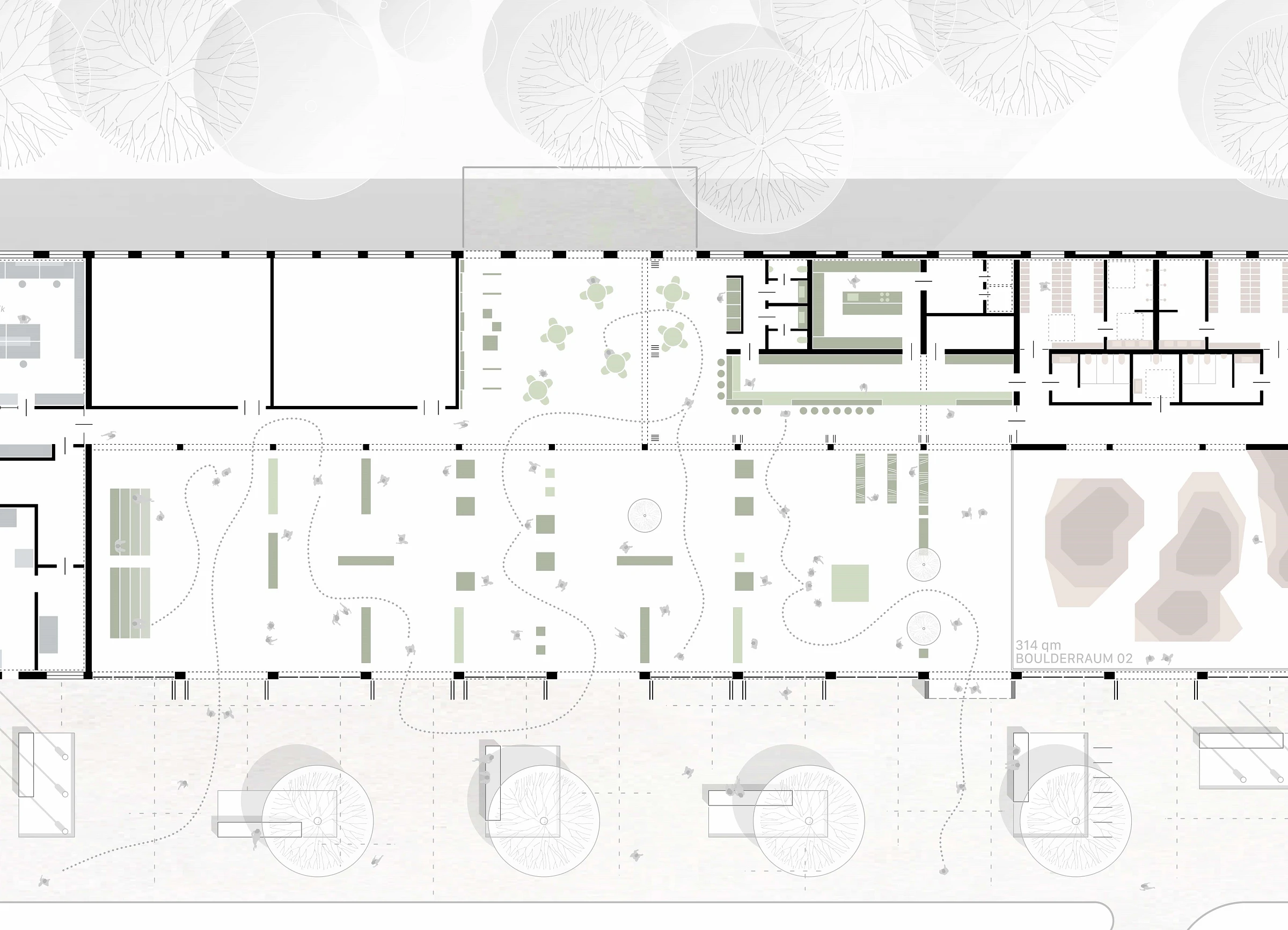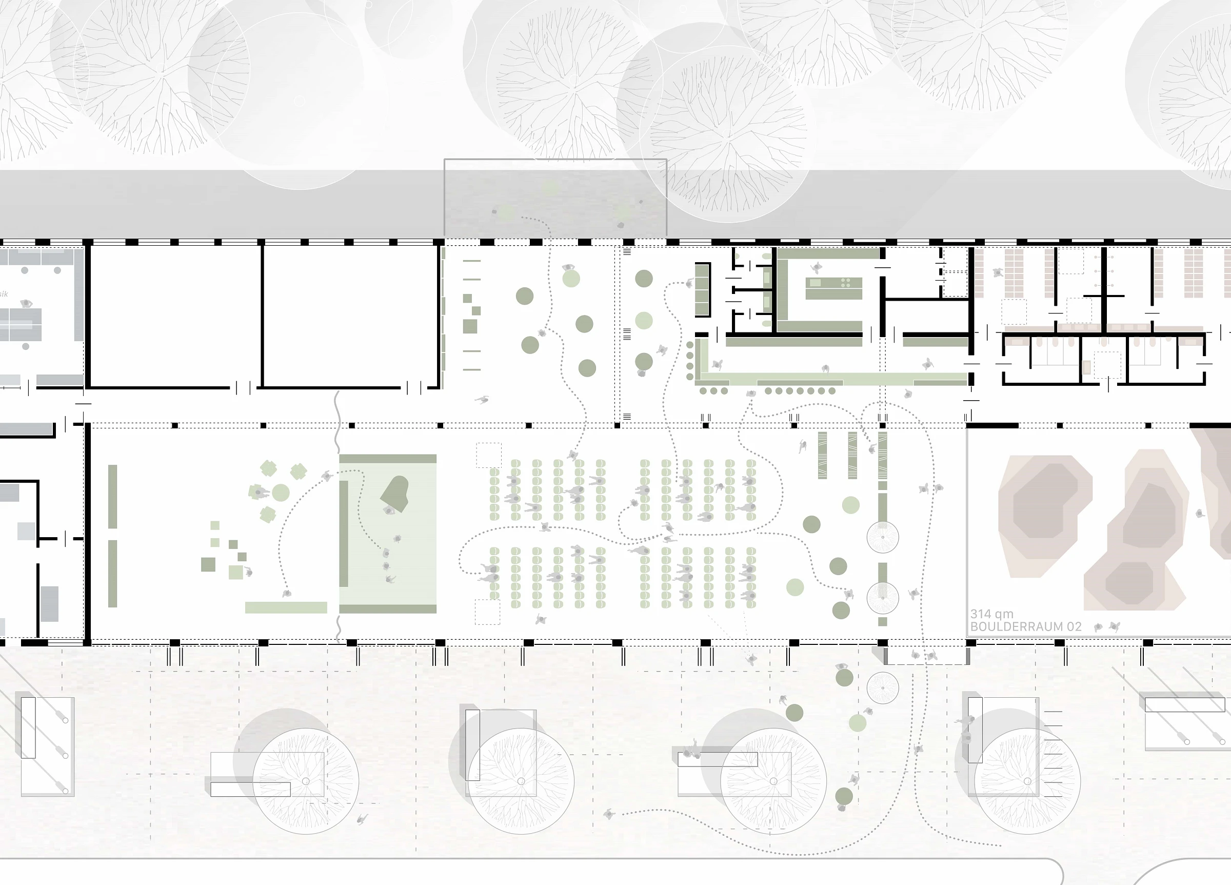 Die unterschiedlichen Bereiche der ehemaligen Panzerhalle werden durch gezielte und angemessene bauliche Eingriffe umstrukturiert, um einen idealen Rahmen für die neuen Nutzungen zu schaffen. Im Westflügel entsteht eine Wissenswerkstatt, die Raum für kreatives und handwerkliches Arbeiten bietet. Der Mittelbereich wird als Multifunktionshalle genutzt und zusätzlich durch ein Café ergänzt, das als Treffpunkt und Aufenthaltsort dient. Im Ostflügel sind eine Boulderhalle sowie öffentliche Toiletten vorgesehen, die das Gesamtangebot funktional abrunden und die Halle zu einem vielseitig nutzbaren Ort für alle Besucherinnen und Besucher machen.